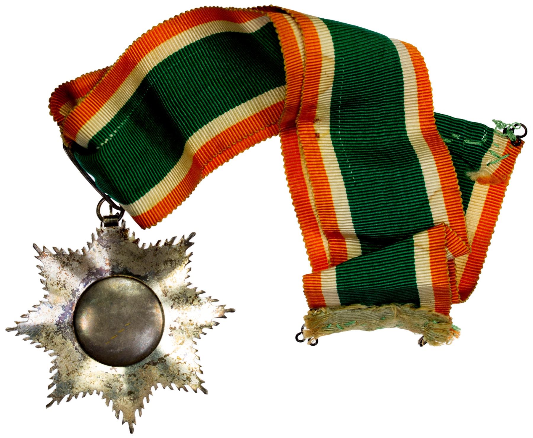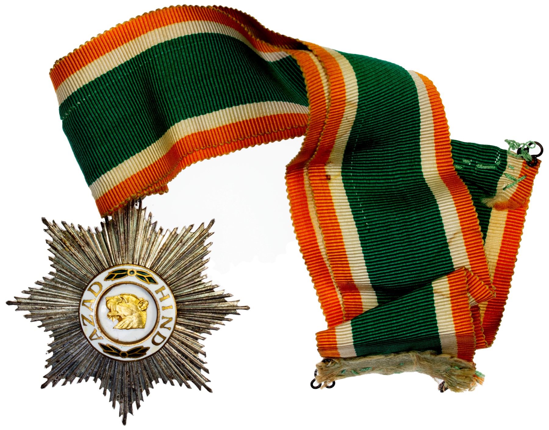 INDIA: Azad Hind Government, silvered AE order, Azad Hind Grandstar, Sher-e-Hind without swords neck badge with original ribbon, AU, ex Joseph E. Lang Collection. The Sher-e-Hind (Tiger of India) was the highest military decoration awarded by the Imperial Japanese supported Provisional Government of Free India (Azad Hind Government), established in Singapore in 1943. First instituted by Subhas Chandra Bose in Nazi Germany, this award was later also awarded to troops of the Indian National Army in South East Asia. The award could be conferred with swords for velour in combat, and without swords for non-combat awards and were awarded to both Indian and German members of the Legion Freies Indien, representing a significant aspect of India's freedom struggle during World War II. The medals were designed by Souval of Vienna, featuring an enameled central circle with tiger bust on an eight-point star. The ribbon was green with white and orange edges.