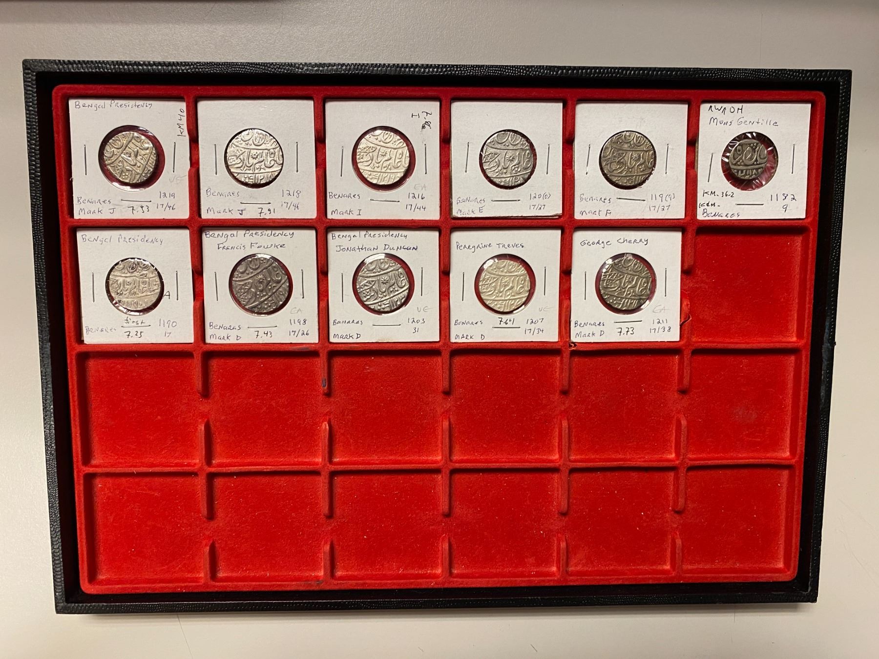INDIA: LOT of 11 silver rupees, Bengal Presidency: type KM-40 of Muhammadabad Benares, dated AH1190, 1198, 1203, 1207, 1211, 1216, 1218, and 1219, plus two with partial dates, all VF or slightly nicer, a couple with testmarks, and Awadh: KM-36.2, AH1192 year 9, Fine; retail value $350, lot of 11 pieces.