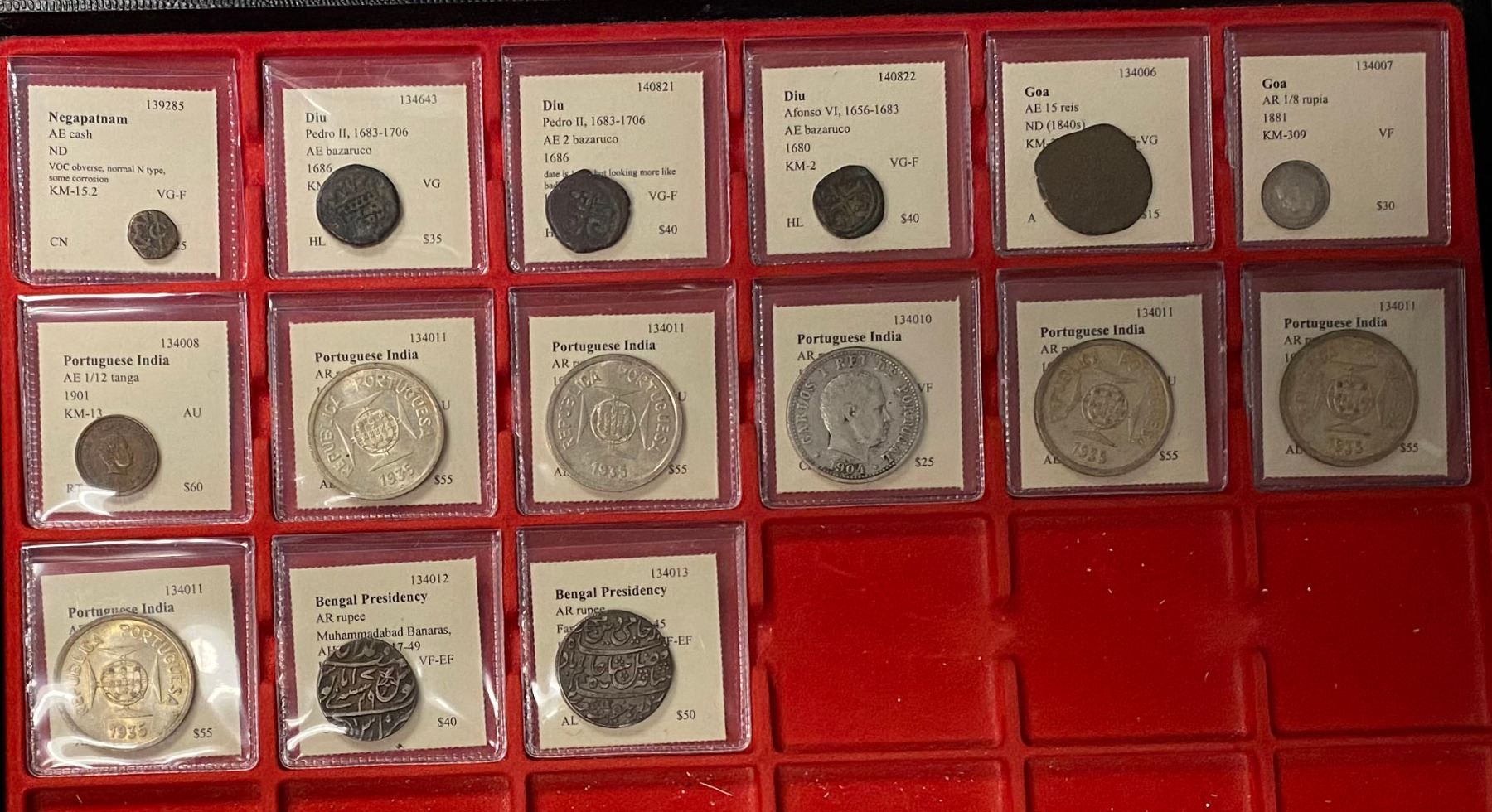INDIA: LOT of 15 coins, including Dutch/Negapatnam (1 pc), Portuguese/Diu (3), Goa (1), Portuguese India (8), and Bengal Presidency (2); average circulated grades, in our attributed 2x2 holders, viewing recommended; retail value $625, lot of 15 pieces.