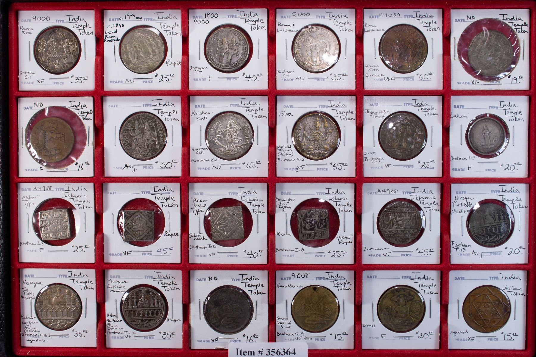 INDIA: LOT of 25 temple tokens, various different types, most in silvered bronze or billon and from the mid-19th to mid-20th century, including 12 Hindu (seven Rama-tankas, and five with various other Hindu deities, incl. one with four-arm Kali holding severed head), 9 Muslim (three Madinat Sharif, and six Akbar rupee imitations: 5 square, and a round one not in Brotman), 2 Sikh, 1 Buddhist token, plus one other; most identified and with Brotman number, several EF or better and with attractive luster; retail value $600, lot of 25 pieces.