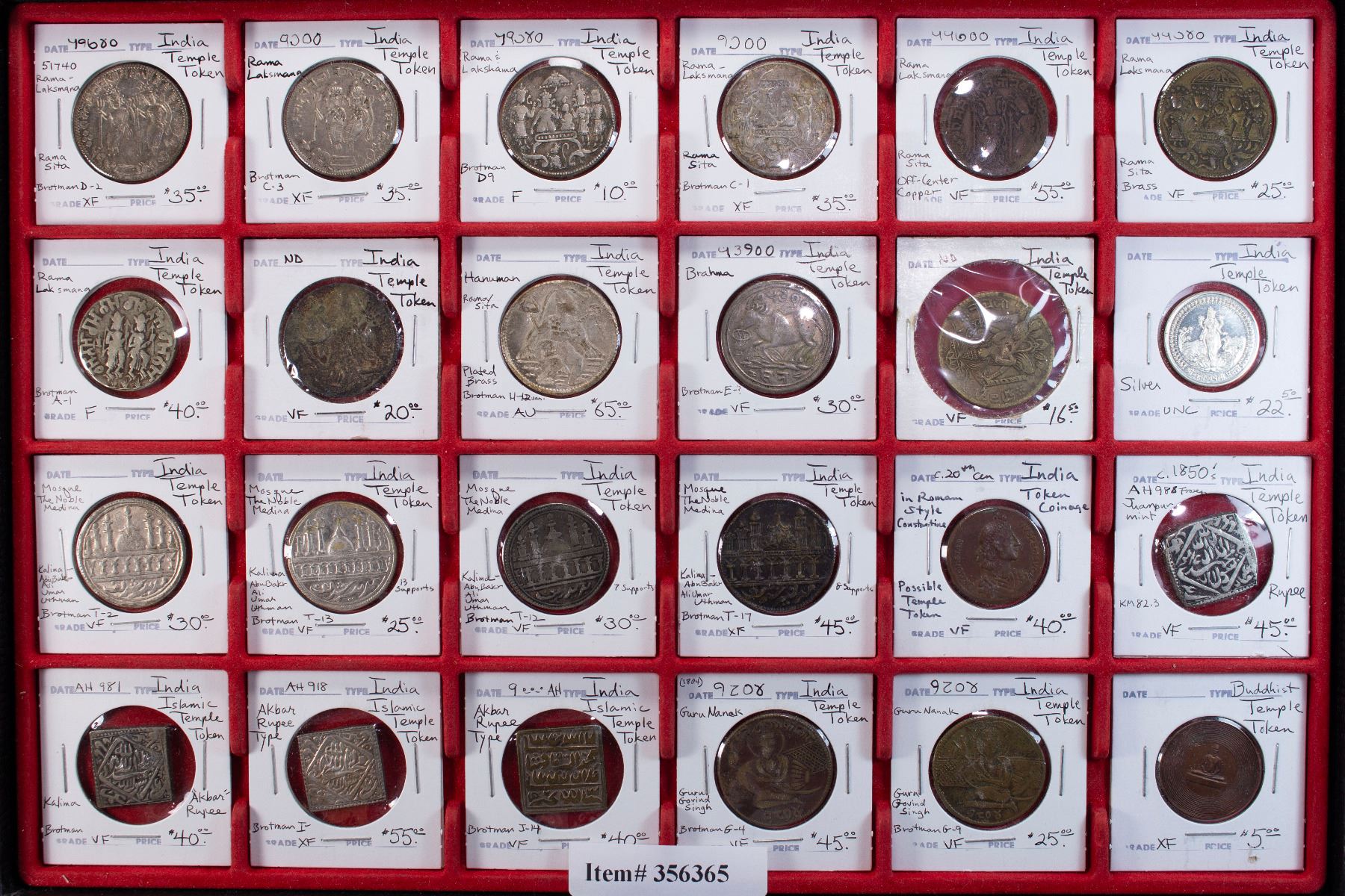 INDIA: LOT of 25 temple tokens, various different types, most in silvered bronze or billon and from the mid-19th to mid-20th century, including 12 Hindu (six Rama-tankas, and six with various other Hindu deities, incl. one with four-arm Kali holding severed head, one with Hanuman, another with Nandi), 9 Muslim (four Madinat Sharif, and five Akbar square rupee imitations), 2 Sikh, 1 Buddhist token, plus one other; most identified and with Brotman number, several EF or better and with attractive luster; retail value $600, lot of 25 pieces.
