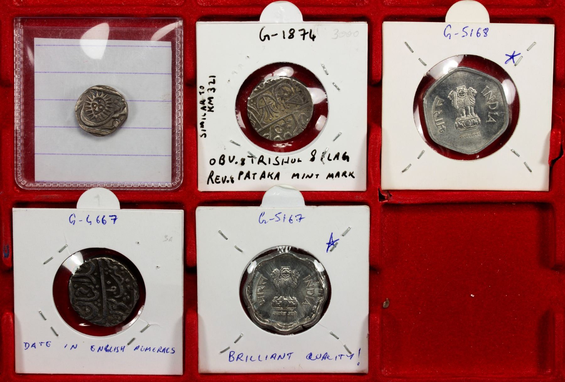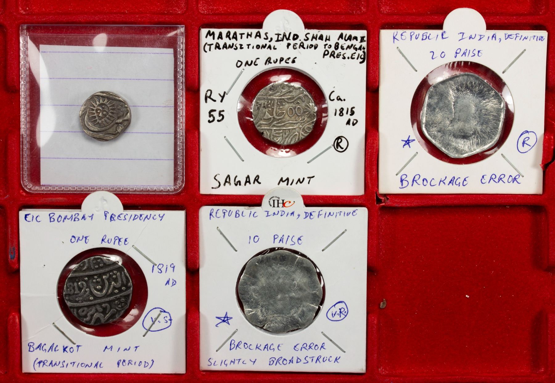 INDIA: LOT of 3 silver and 2 base metal coins, Silver: Bagalkot rupee 1819 (VF, 1 banker's mark); Ravishnagar Sagar rupee year 55 (frozen year, choice VF); and Indore 1/2 rupee xxx7 (VF-EF); and Base Metal: Republic, brockage errors of the 10 paise and the 20 paise, both Unc; all in the consignor's holders or flips; retail value $300, lot of 5 pieces.