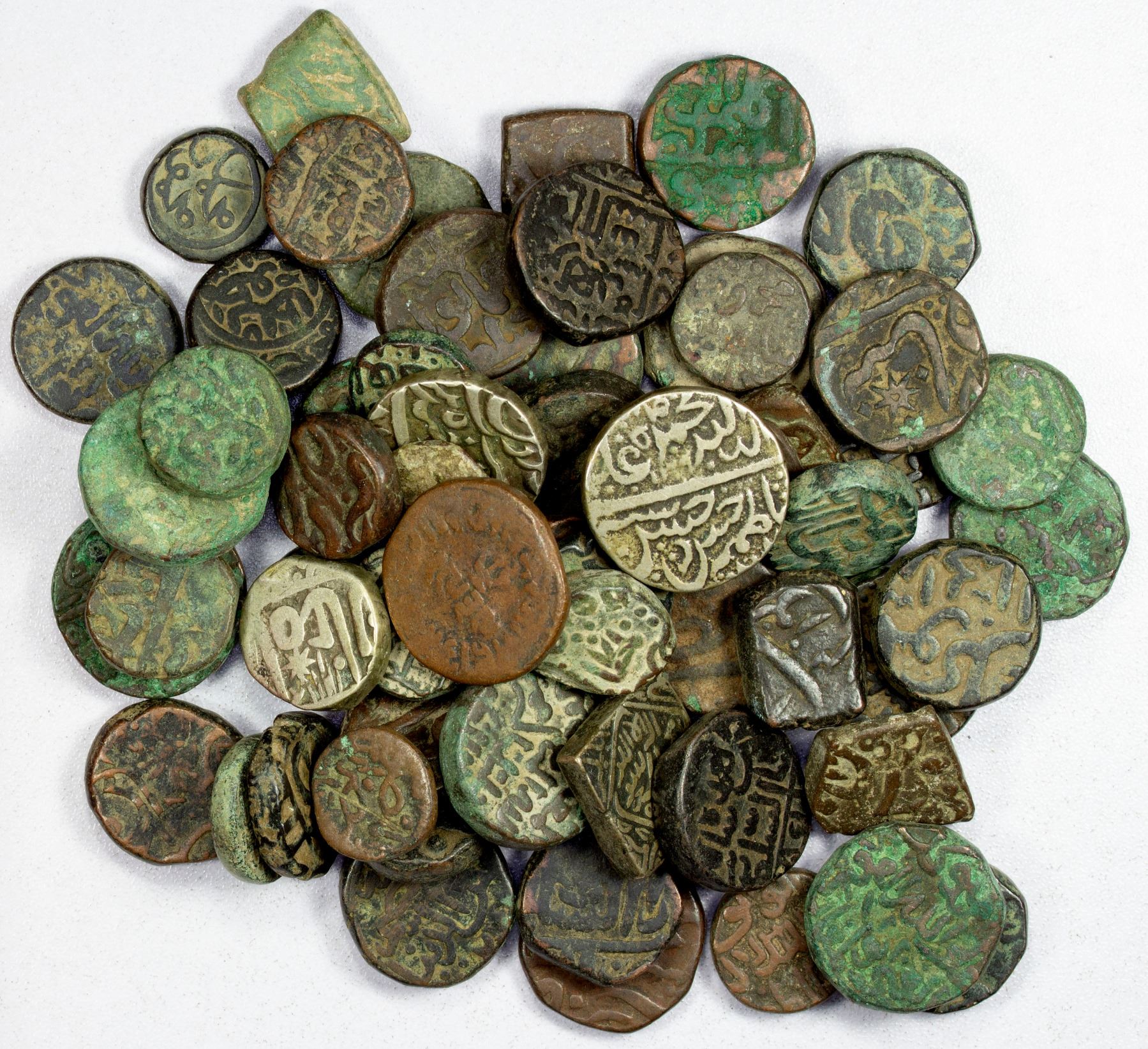 INDIA: LOT of 59 copper & 4 silver coins, the copper is mostly common types of the Bahmanid Sultanate (average VG to Fine) and a few miscellaneous common types, the silver 2 common rupees and 2 debased silver temple tokens (average Fine to VF condition); retail value $350, lot of 63 pieces.
