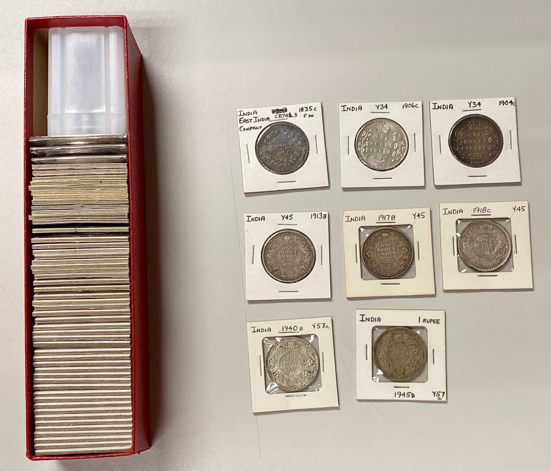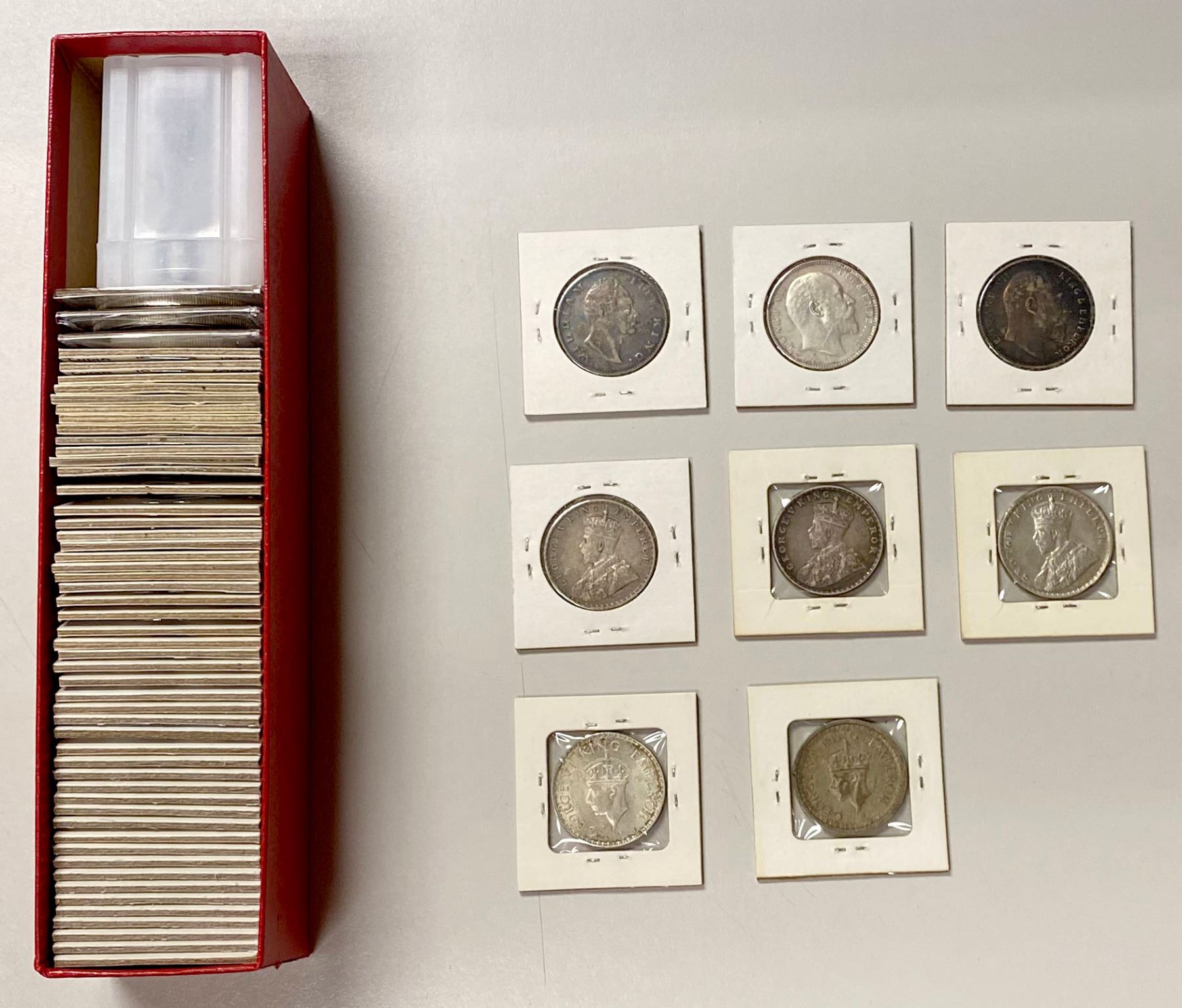 INDIA: LOT of 61 coins, including silver rupees from 1862 to 1945 (32 pcs), copper coins of early British India (14), silver coins of the Indian States (4, including a rupee of Alwar), 5 silver crowns of the republic and 6 more; retail value $800, lot of 61 pieces, ex Almer H. Orr III Collection.