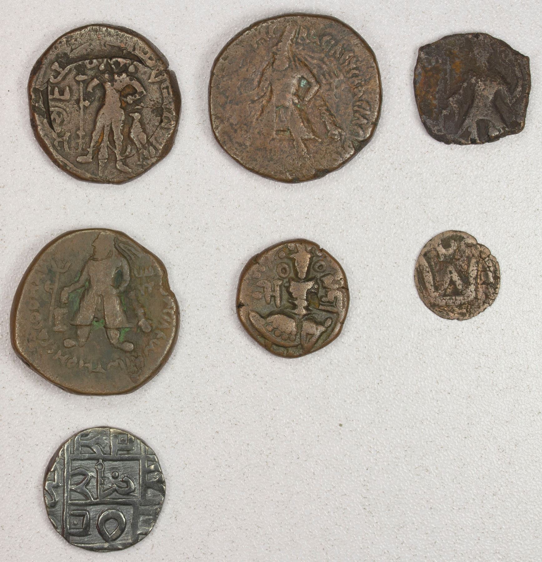 INDIA: LOT of 7 hammered coins, including 3 Kushan coppers (two tetradrachms of Vima Kadphises, and a reduced unit temp. Vasudeva II, cf. Zeno-24309), a Yaudheya copper, a medieval Kashmir copper (Sangrama Deva, Mitch-179), a Cooch Behar silver 1/2 rupee (Moda Narayan), plus an ancient Central Asian copper of Chach; Fine to VF conditions; retail value $250, lot of 7 pieces.
