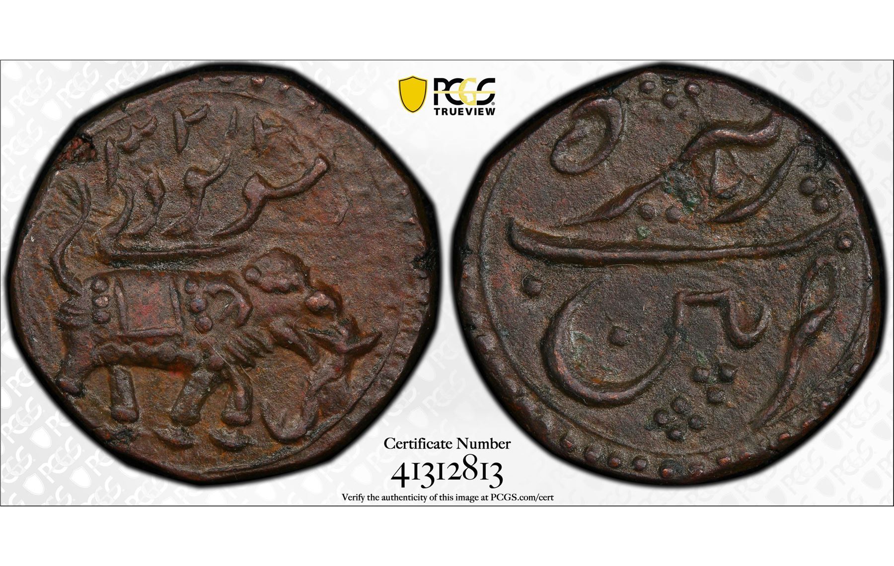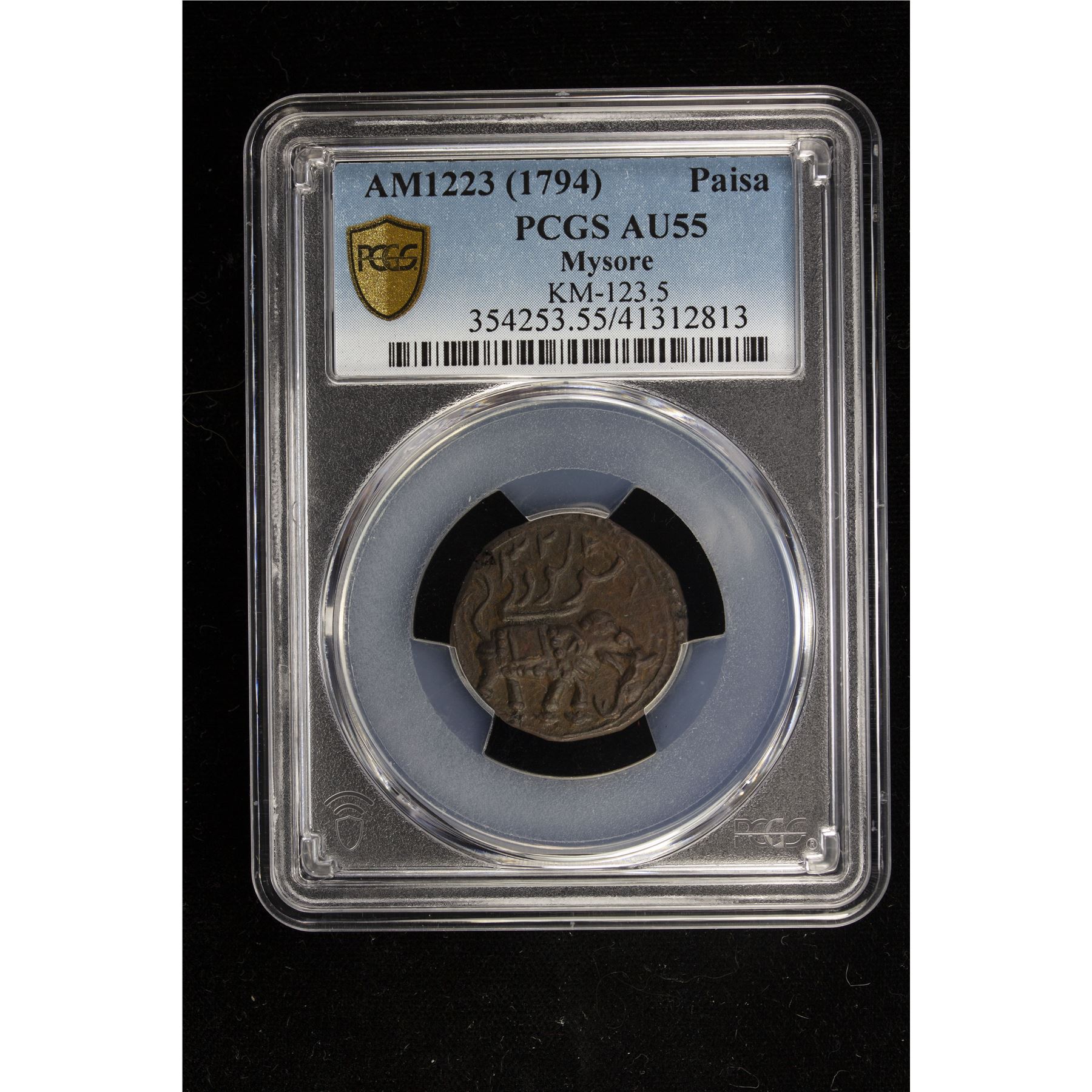 INDIA: MYSORE: Tipu Sultan, 1782-1799, AE paisa, Patan, AM1223, KM-123.5, elephant right, a well struck lovely chocolate-brown nearly mint state example! PCGS graded AU55.