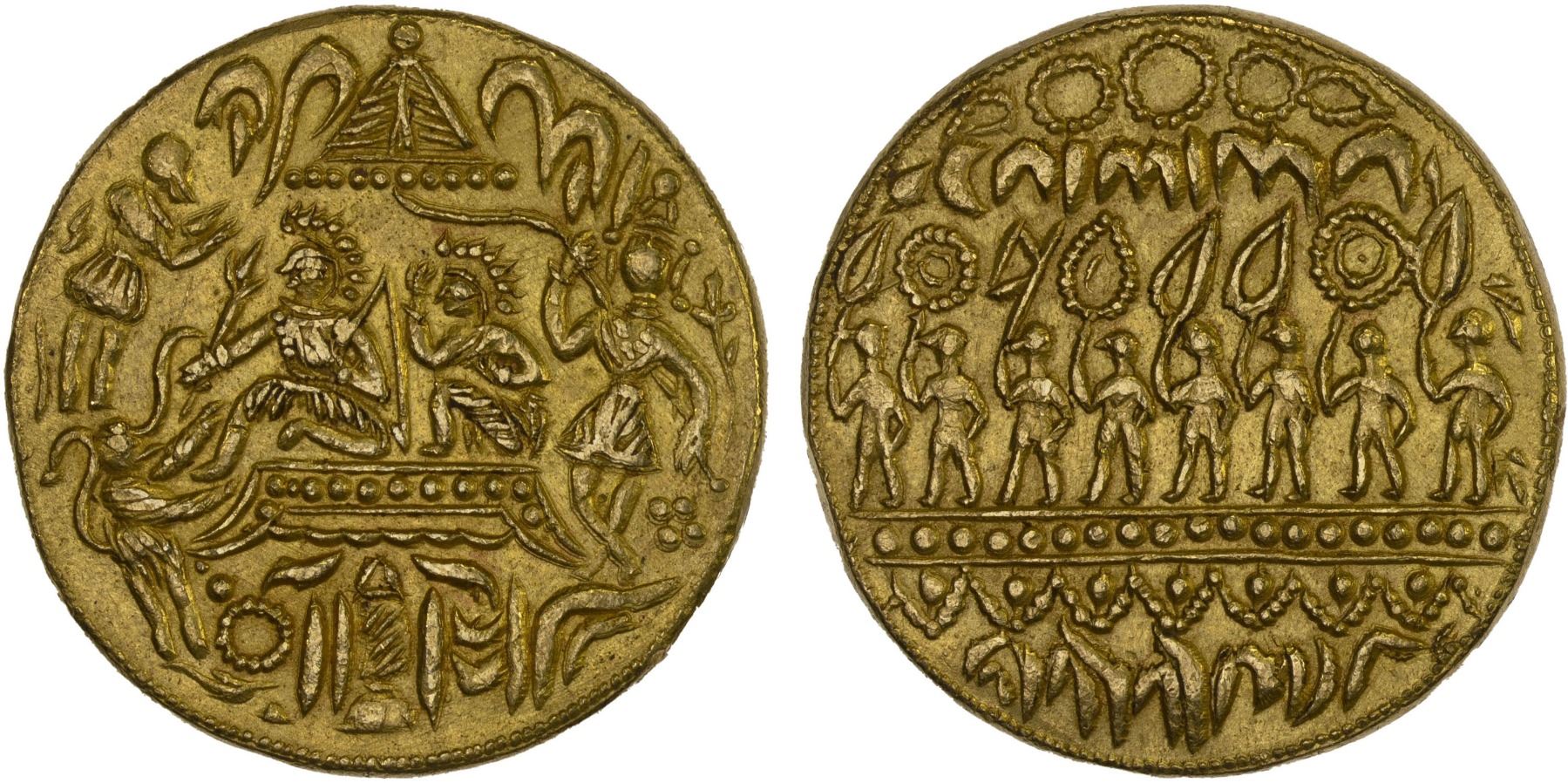INDIA: Ramatanka Hindu token, late 19th or 20th century, AV double ramatanka (23.30g), Rama and Sita seated above a platform, the Monkey god Hanuman and Lambavat to left, Lakshmana to right, with various symbols around // eight Rishis walking in procession to the left across a stage, holding emblems aloft, various decorations around; late style, probably struck after about 1900, AU, RR, ex Syed Rabbi Collection.