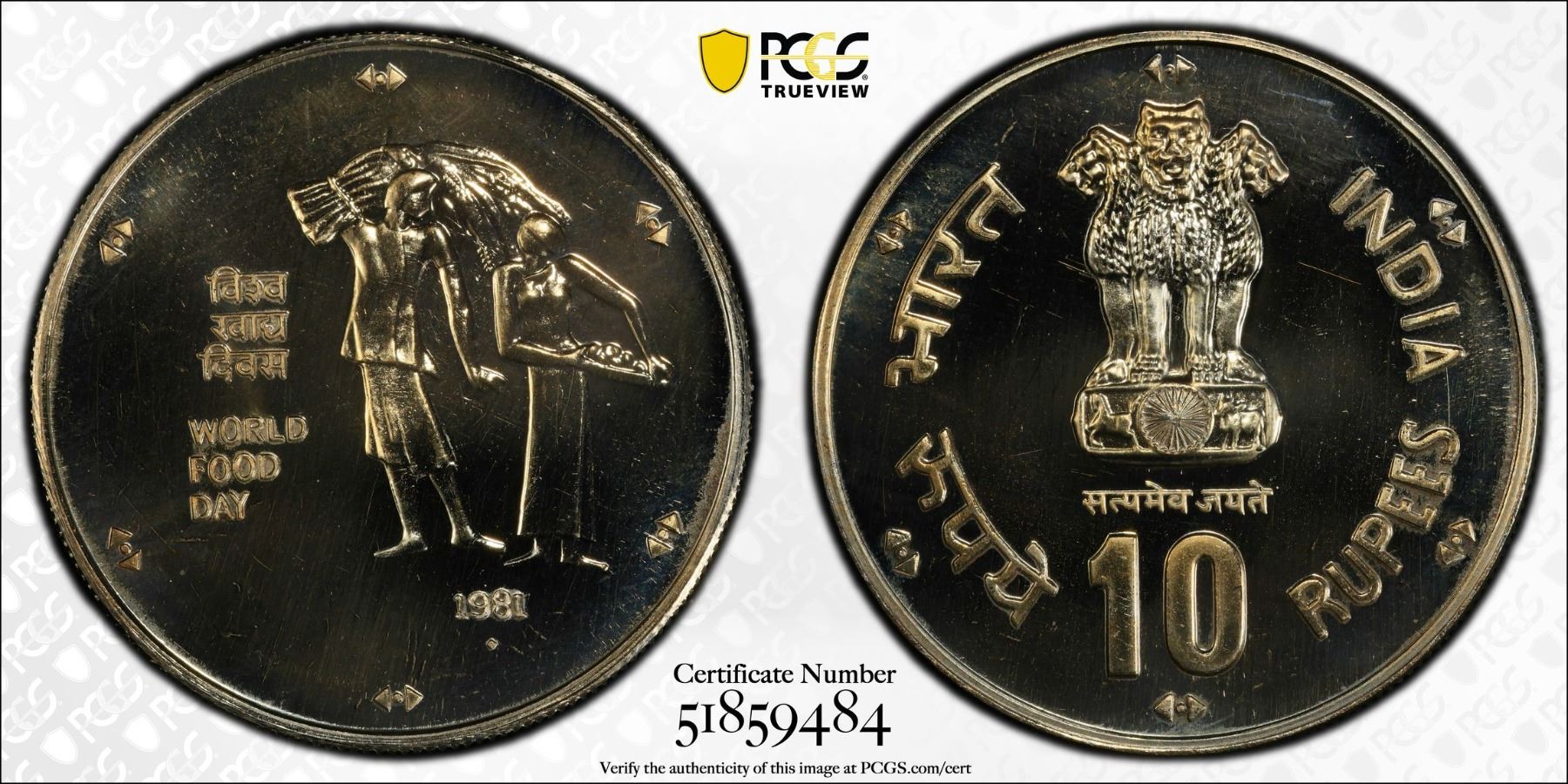 INDIA: Republic, 10 rupees, 1981, KM-664, World Food Day, a superb example, PCGS graded MS65, ex Almer H. Orr III Collection.
