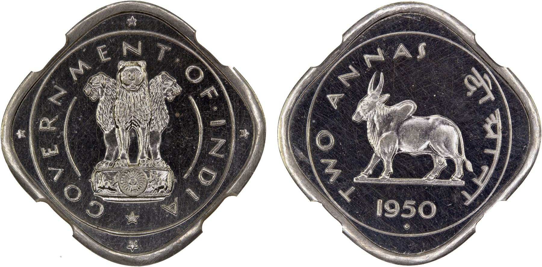 INDIA: Republic, 2 annas, 1950(b), KM-4, a wonderful lovely quality example! PCGS graded Proof 63, ex Stephen Album Internet Auction 20, Lot 317.