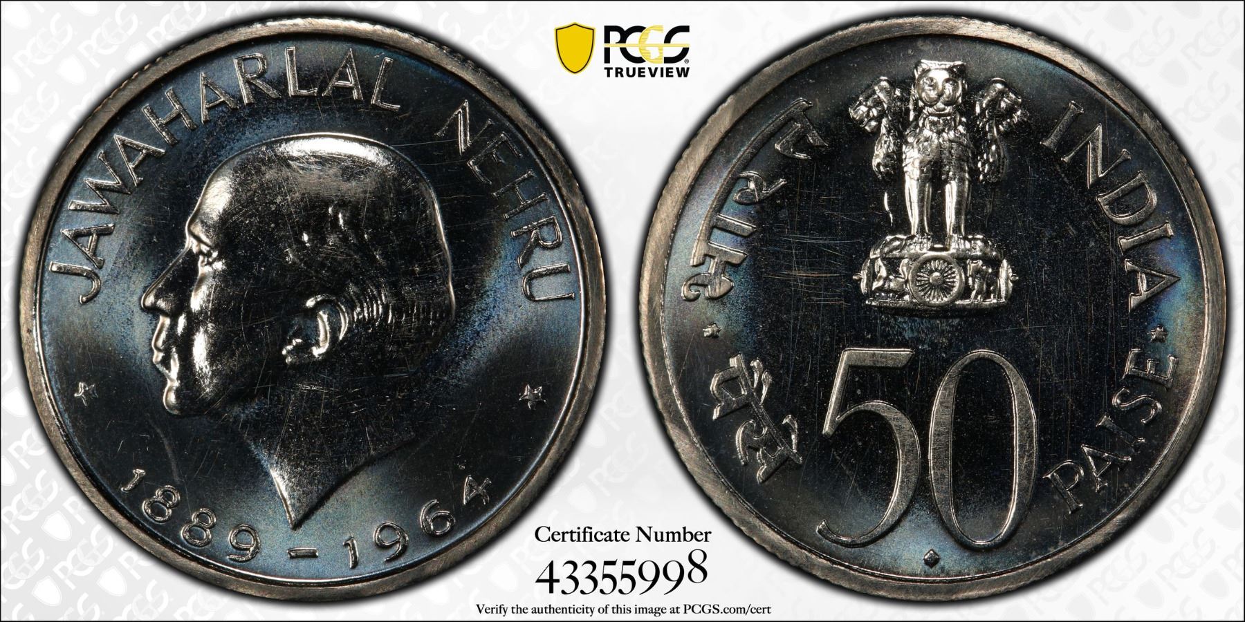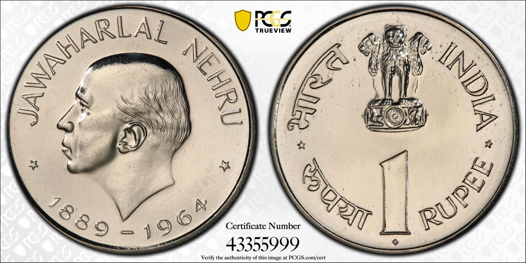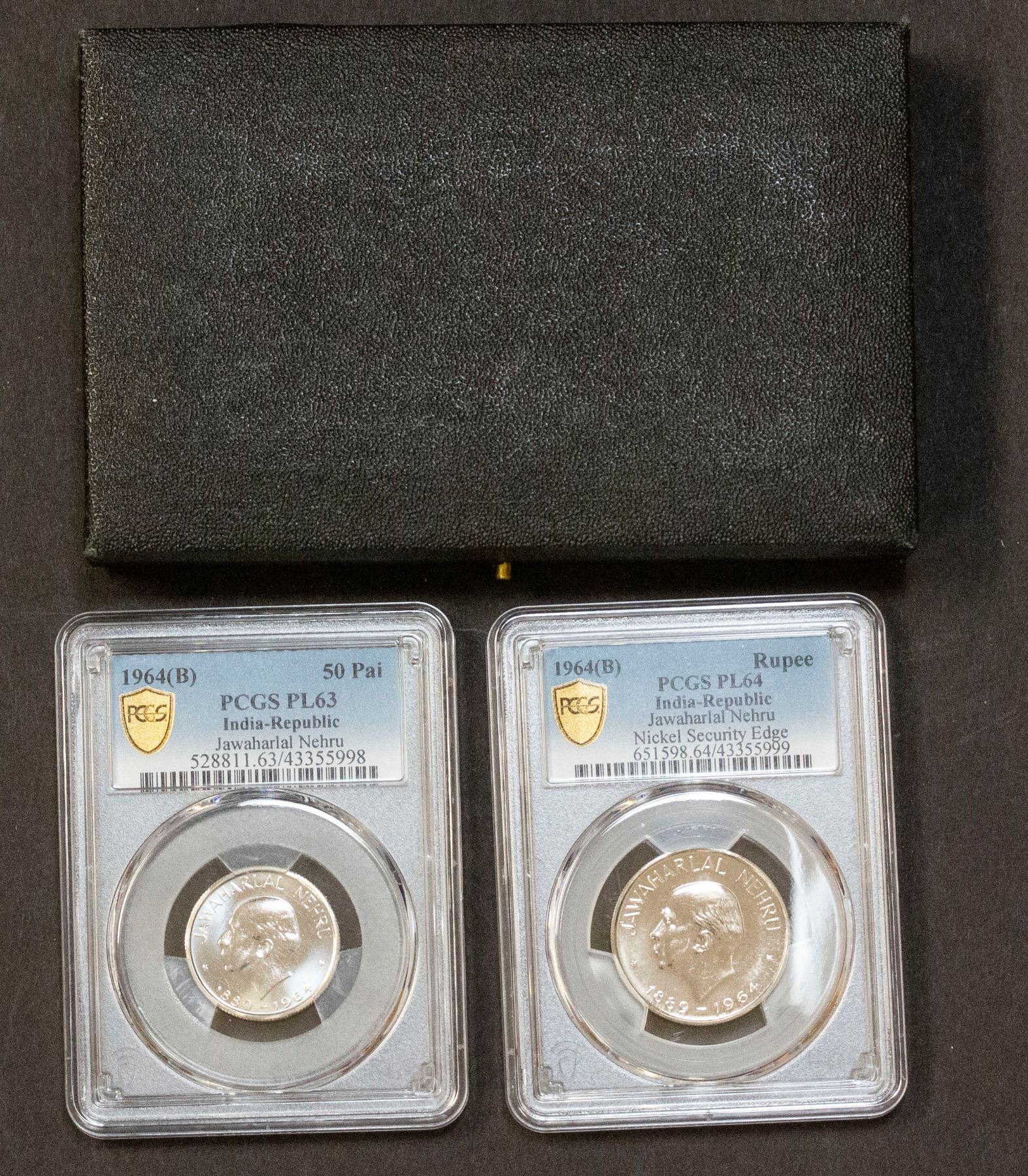 INDIA: Republic, 2-coin proof set, 1964(b), KM-56, Ra-RB-8, set includes 50 paisa and 1 rupee - Death of Jawaharlal Nehru, in PCGS holders PL-63 and PL-64 respectively, with original black rexin case of issue, set of 2 coins. Incorrectly described by PCGS as prooflike. These are proof issues of the Bombay mint.