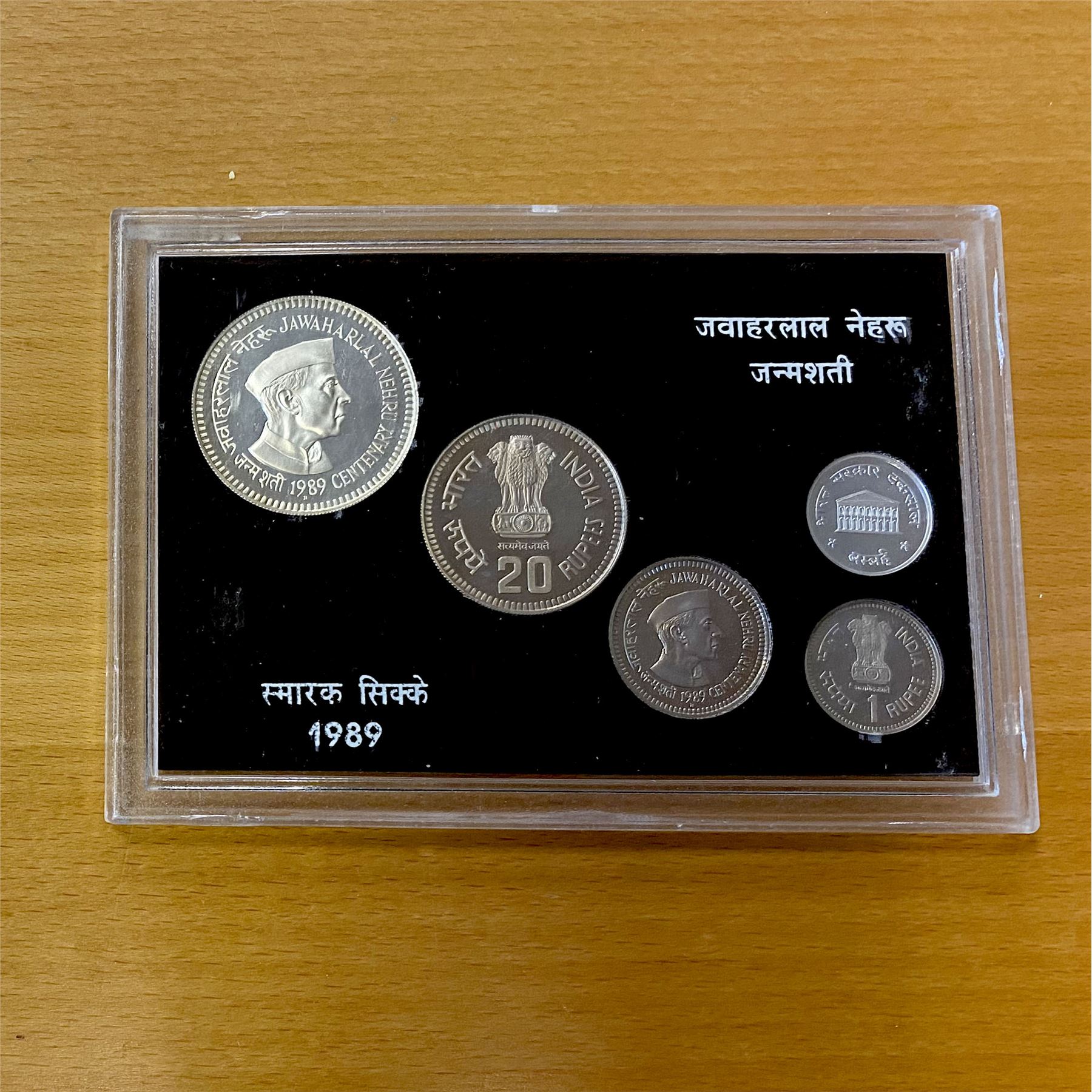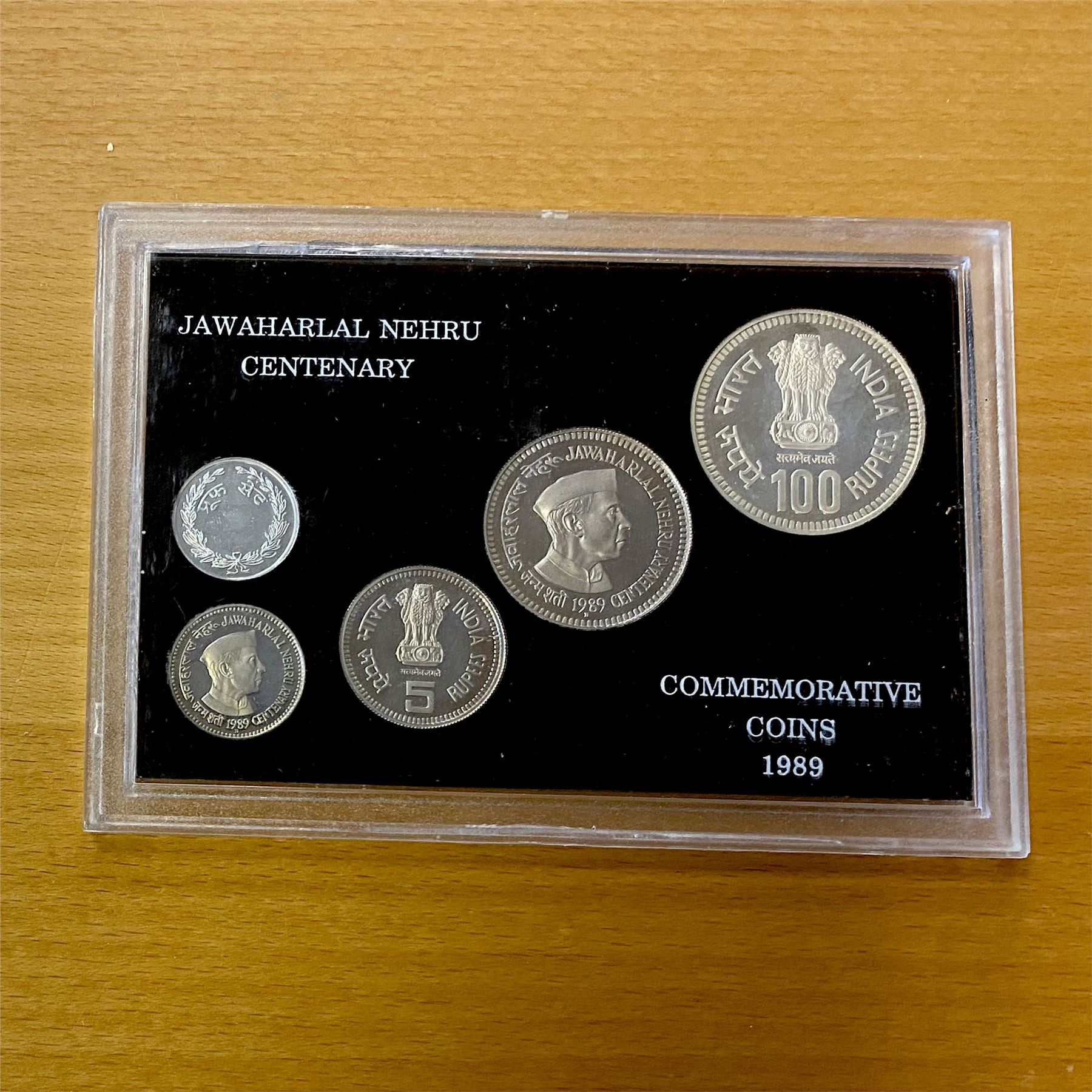 INDIA: Republic, 4-coin proof set, 1989, KM-PS44, RB-135, Jawaharlal Nehru Birth Centennial commemorative set including 1 rupee, 5 rupees, 20 rupees, and 100 rupees, plus mint token, in acrylic case, with certificate and the original box of issue, mintage unknown, set of 4 coins.