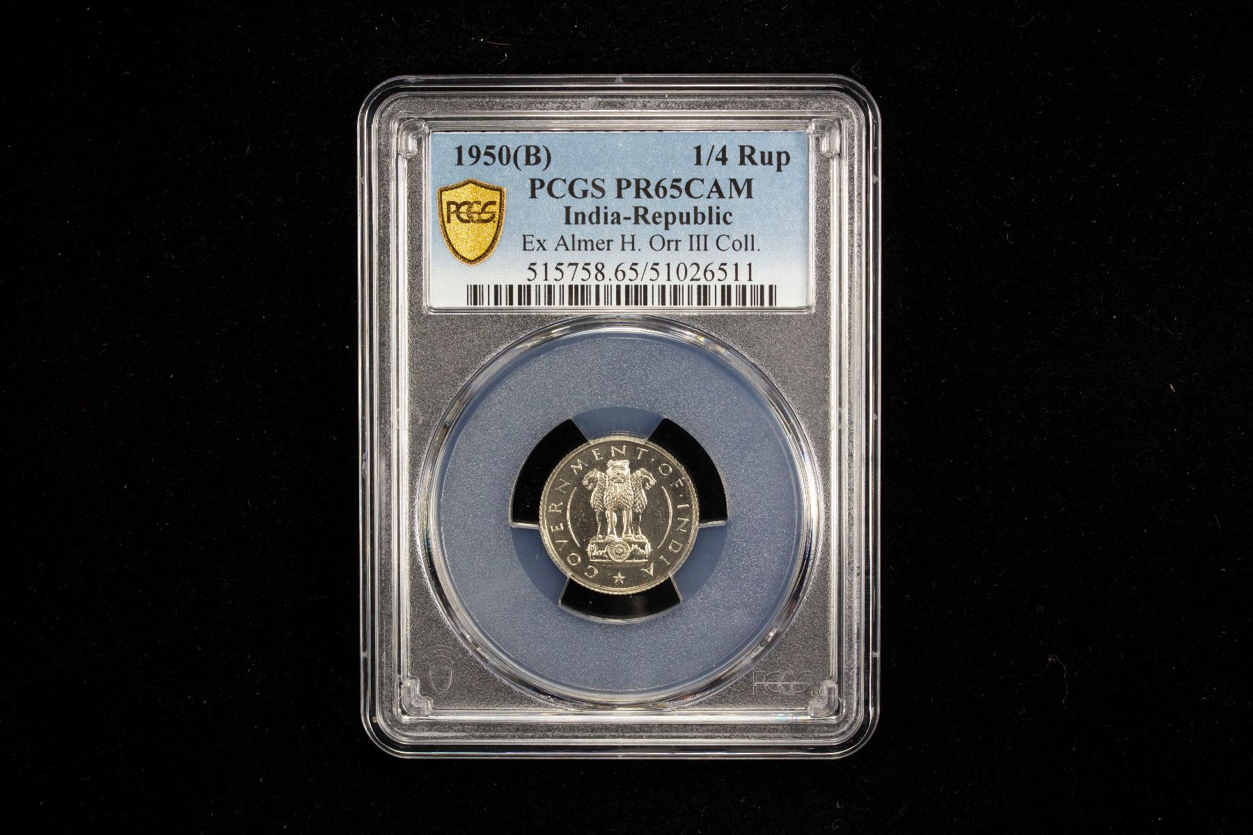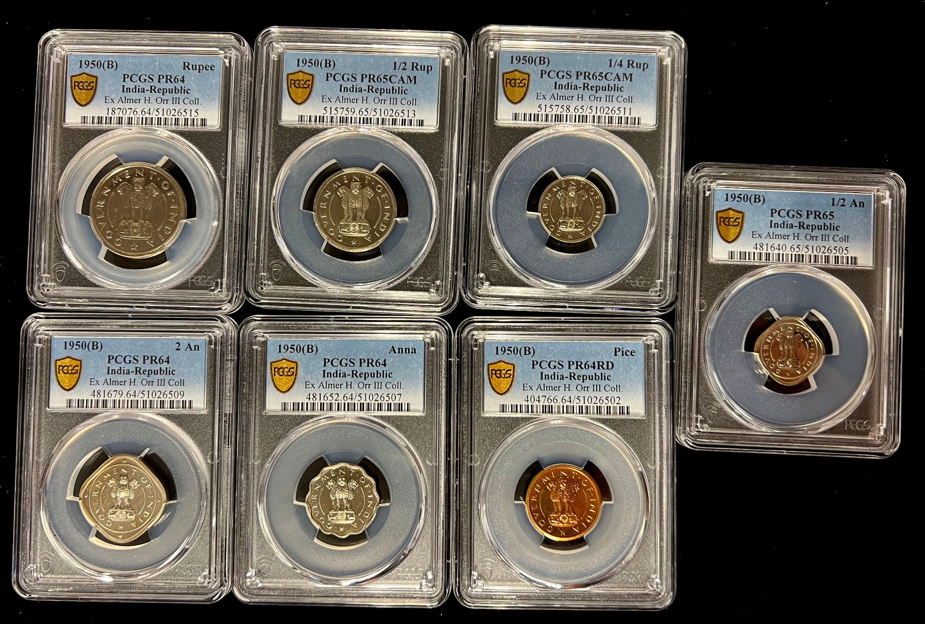 INDIA: Republic, 7-coin proof set, 1950(b), KM-PS1, Rajgor-RB1, PCGS graded set including; 1 pice PF-64RD, ½ anna PF-65, 1 anna PF-64, 2 annas PF-64, ¼ rupee PF-65 CAM, ½ rupee PF-65 CAM, and 1 rupee PF64, a lovely well matched high quality set, set of 7 coins.