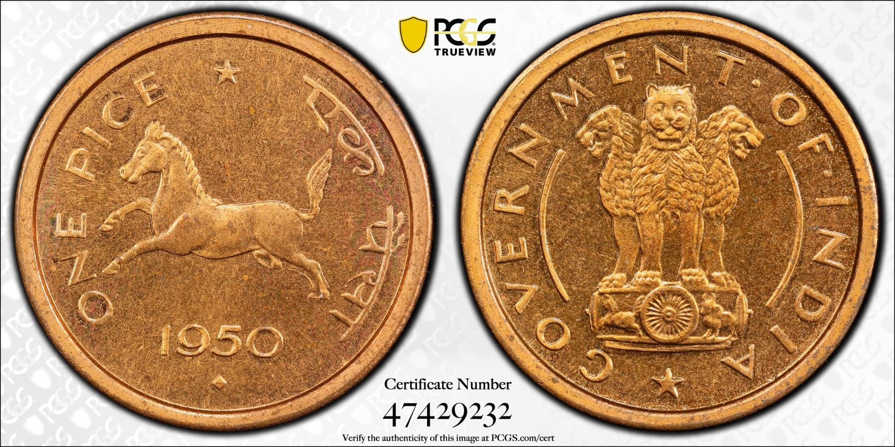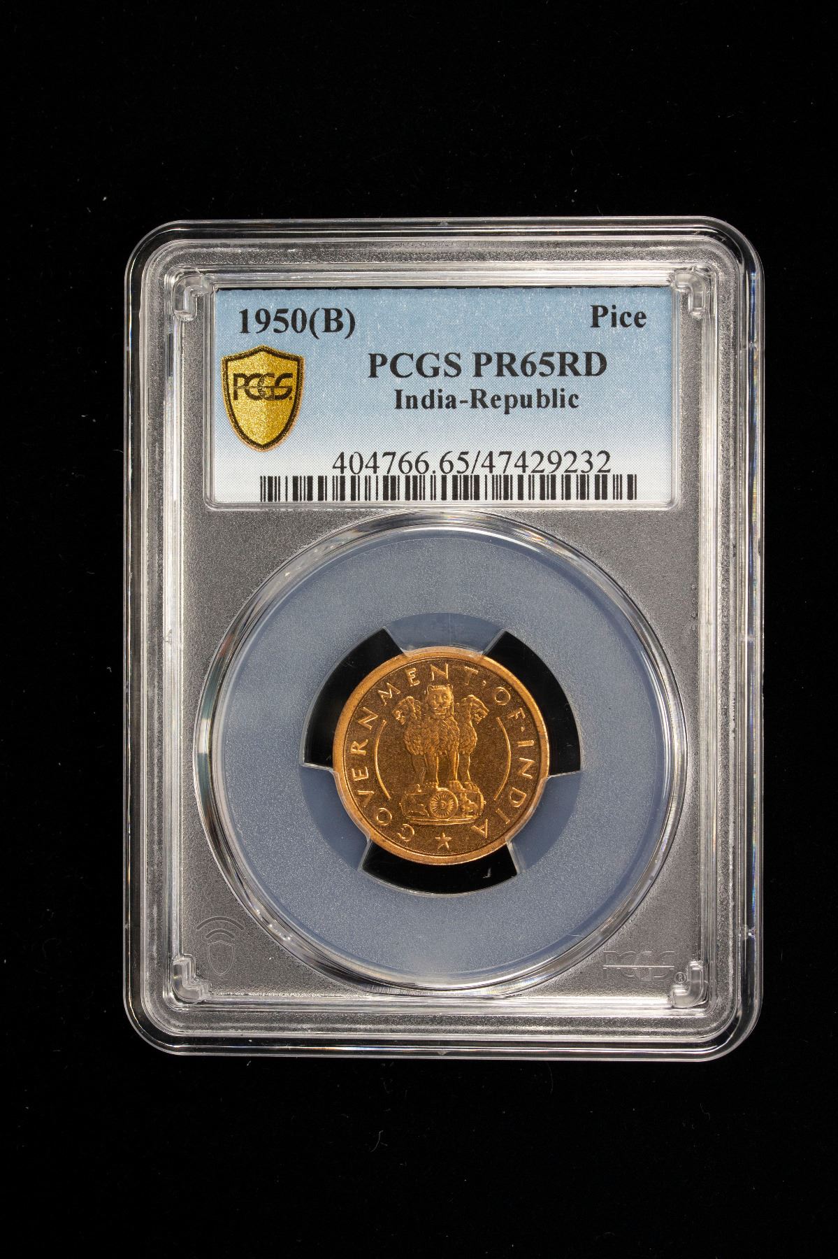 INDIA: Republic, AE pice, 1950(b), KM-1.2, a choice proof quality coin in vibrant red color, PCGS graded PF65 RD.