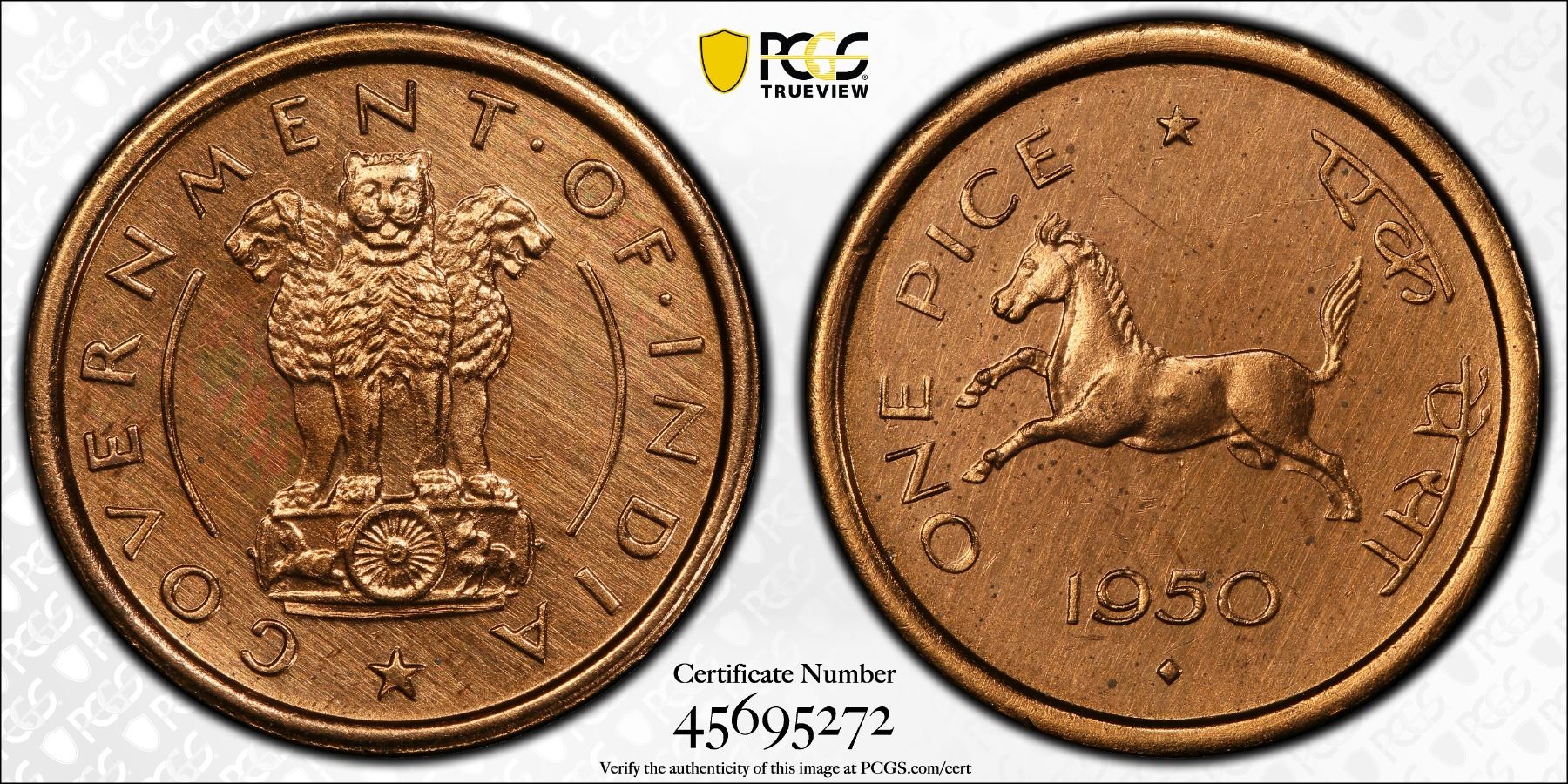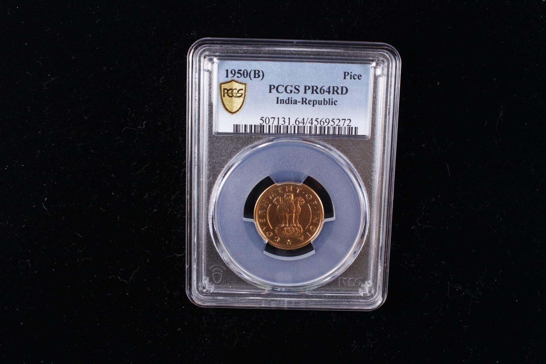 INDIA: Republic, AE pice, 1950(b), KM-1.2, a wonderful proof quality example! PCGS graded Proof 64 RD, ex Stephen Album Internet Auction 20, Lot 317.