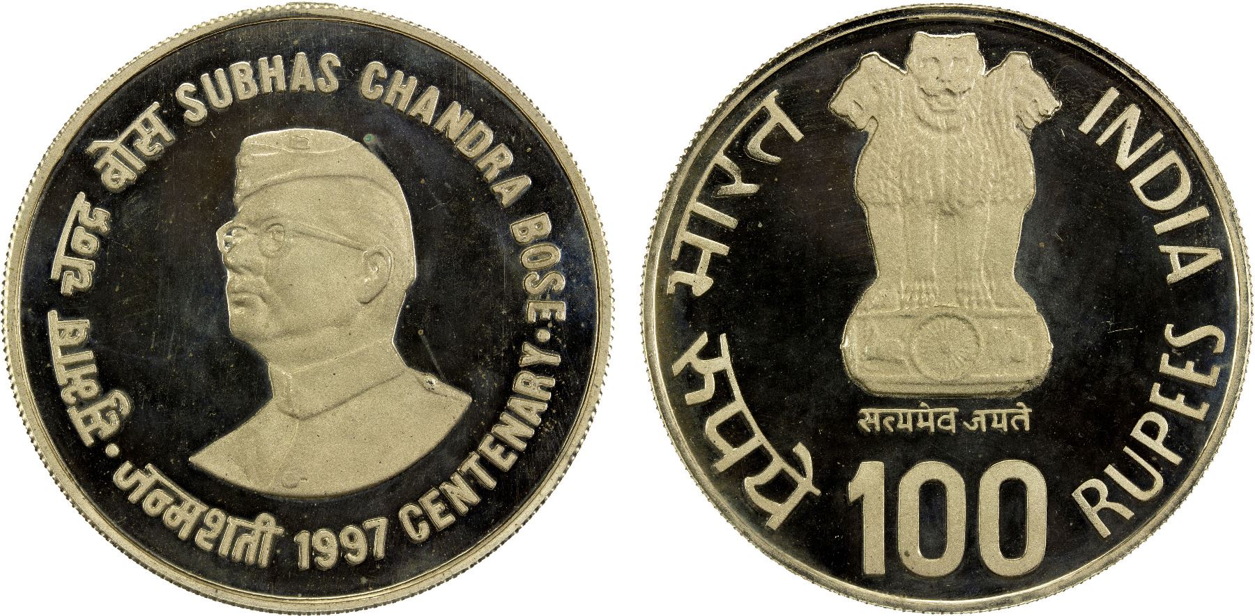 INDIA: Republic, AR 100 rupees, 1997, KM-289, Subhas Chandra Bose, some hairlines, Proof, ex Wolfgang Schuster Collection.