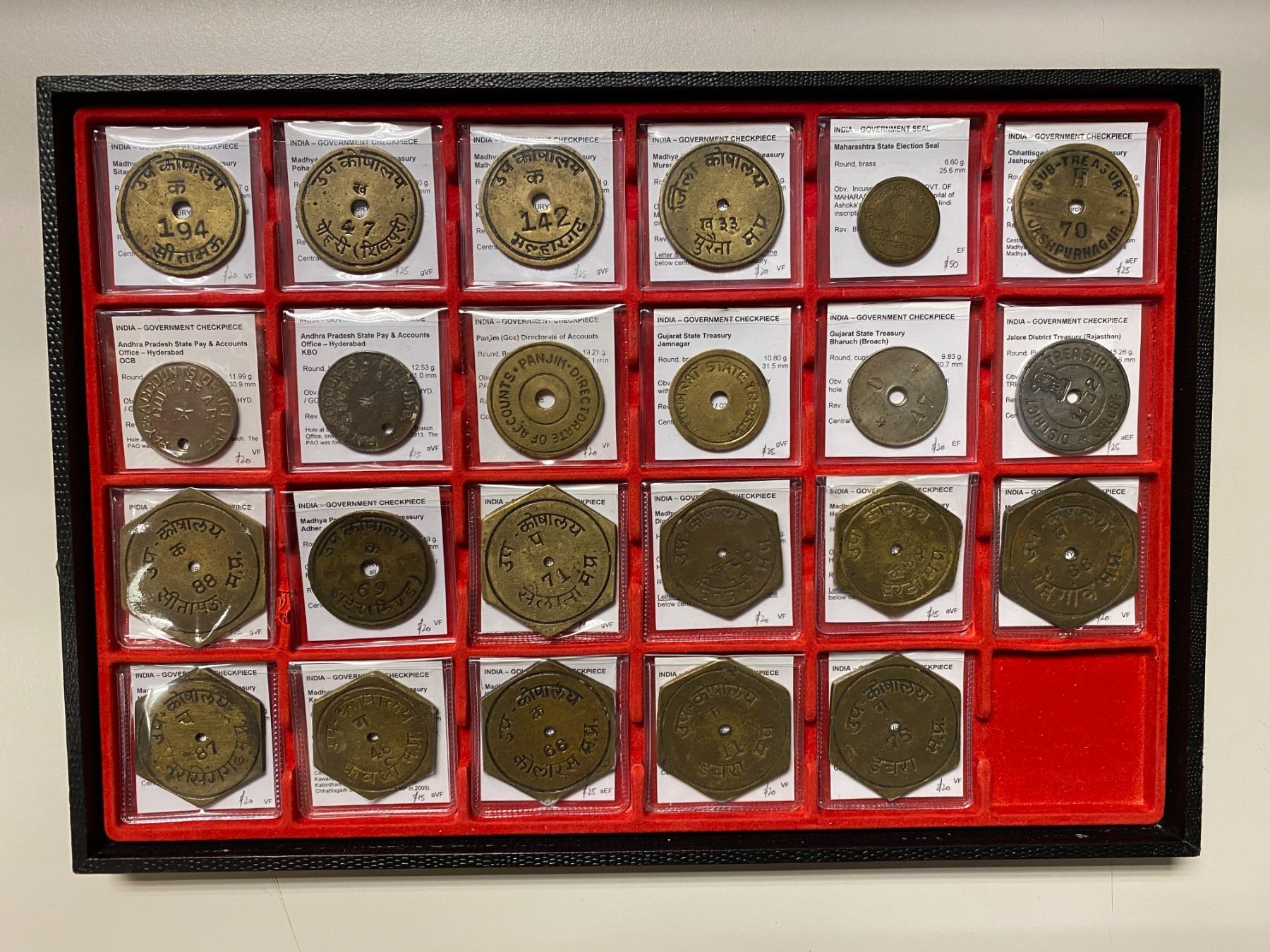 INDIA: Republic, LOT of 23 brass govenment checkpieces, about half hexagonal, the rest round, all with central attachment hole: from Andhra Pradesh (2 pcs: Hyderabad); Chhattisgarh (1: Jashpurnagar); Goa (1: Panjim); Gujarat (2, Bharuch, and Jamnagar); Jalore (1); and Madhya Pradesh (15, including Dabra, Kolaros, Kawardha, Narsinghadh, Mehgadn, Harda, Dindori, Sailana, Murena, Malhargarh Pohari, Adher, and Sitamau); plus one round election seal of Maharashtra; all in at least VF condition; retail value $500, lof of 23 pieces, ex Ian Todd Collection.