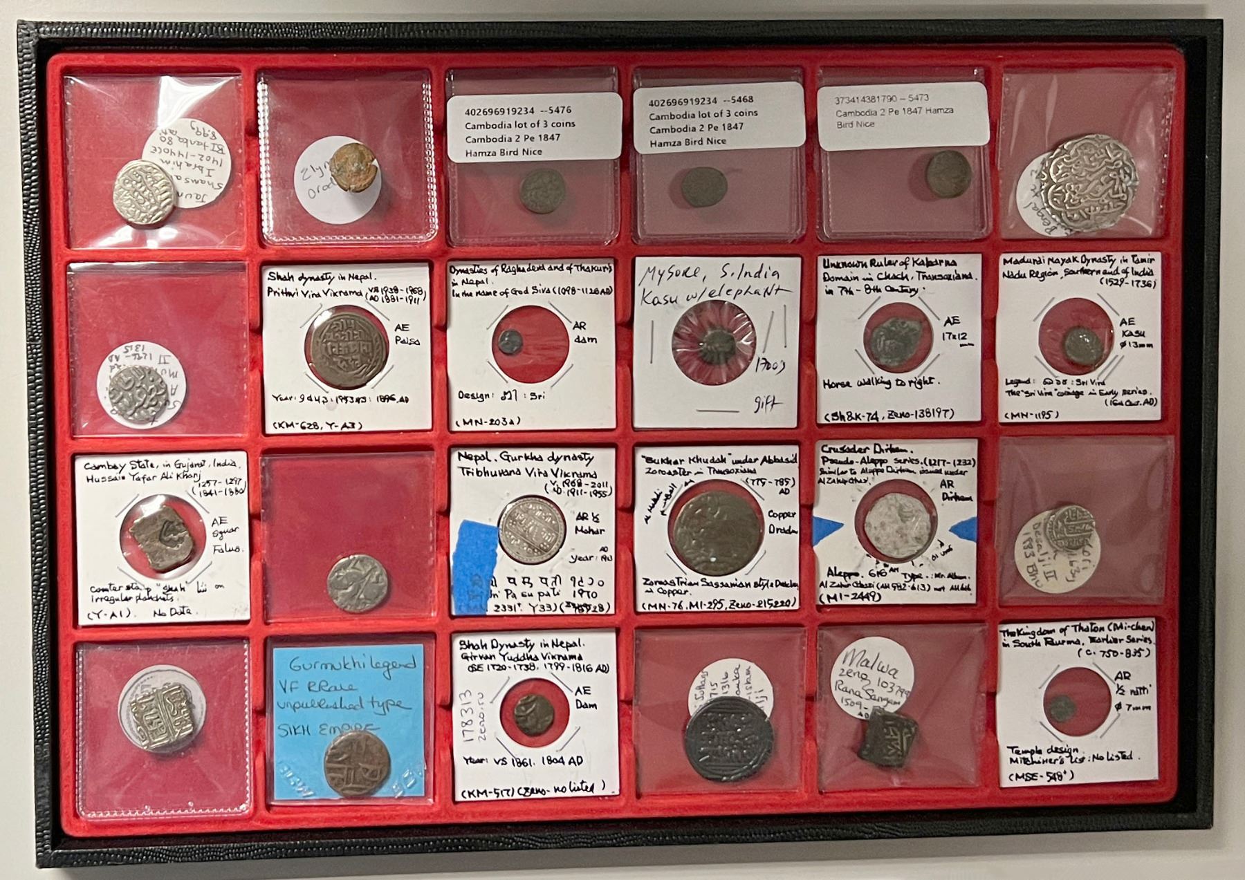INDIA, etc.: LOT of 13 silver & 15 copper coins, Silver: Jaunpur (1 pc), Nepal (2), Delhi Sultanate (2), Bengal (1), Malwa (1), Thaton (1), Western Kshatrapa (2), Crusader (1), Kutch (1), and Hindushahi (1); and Copper & low-level Billon: Nepal (2), Mysore (1), Cambodia (3), Elymais (1), Madurai (1), Cambay (1), Kashmir (1), Malwa (1), Bukharkhodat (1), and uncertain (2); most with consignor's identification, average circulated grades, but many lower grades or poorly struck; retail value $430; lot of 28 pieces.