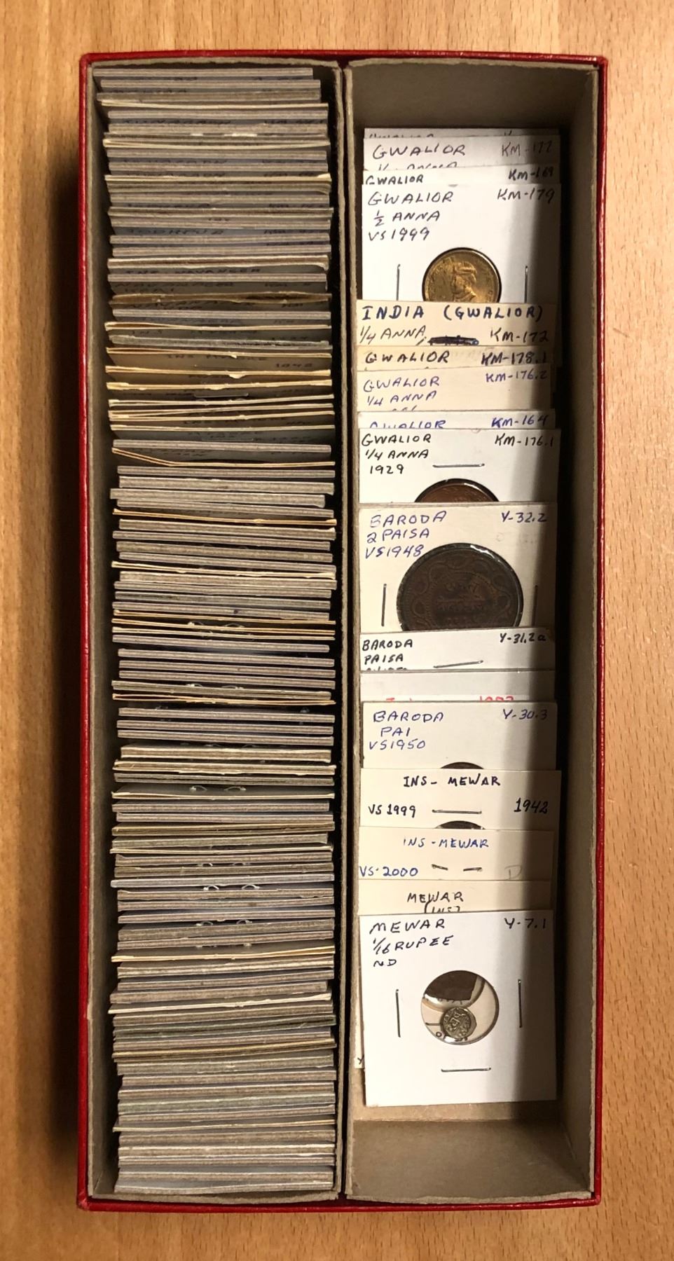 INDIAN STATES: LOT of 114 coins from Baroda, Gwalior, Hyderabad, Jodhpur, Jaisalmir, Junagadh, Mewar, Kutch, Mysore, Nawanagar, Tonk, Travancore, mostly machine-struck, about 20 silver, the rest base metals, featuring a large variety of types, identified by the consignor on accompanying holders, viewing recommended, a very interesting group! most VF or EF, with quite a few AU or BU; retail value $650; lot of 114 pieces.