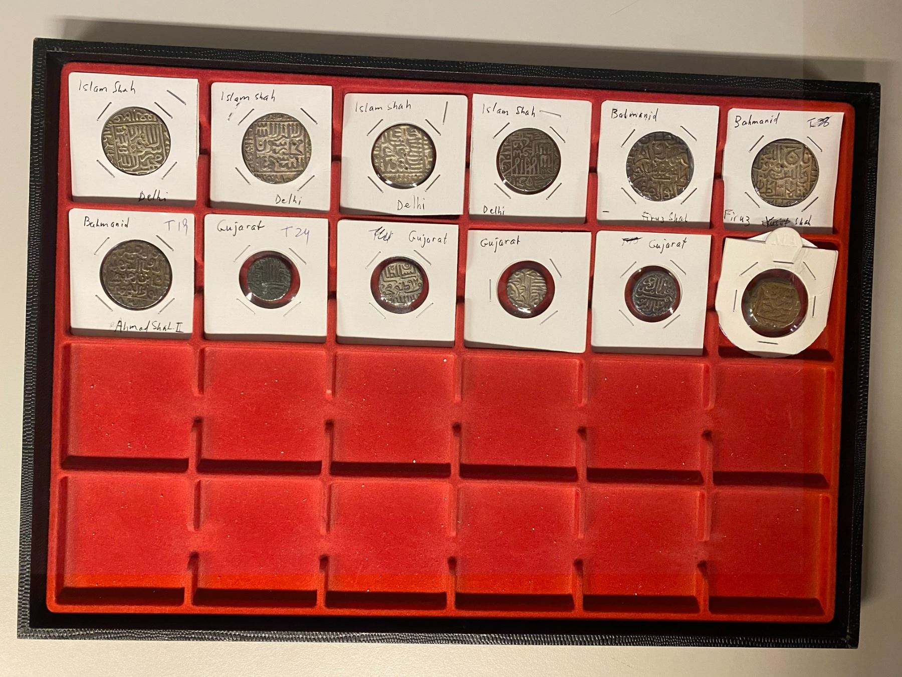 INDIAN SULTANATES: LOT of 11 silver and 1 copper coin, Silver: including Delhi (5 pcs, including one of Muhammad b. Tughlaq and four of Islam Shah); Bahmanid (3, including two of Firuz and one of Ahmad II), and Gujarat (4 common pieces), and Copper: Delhi (1, Sher Shah, only VG condition); nearly all the silver are VF, with a few better; retail value $325, lot of 12 pieces.
