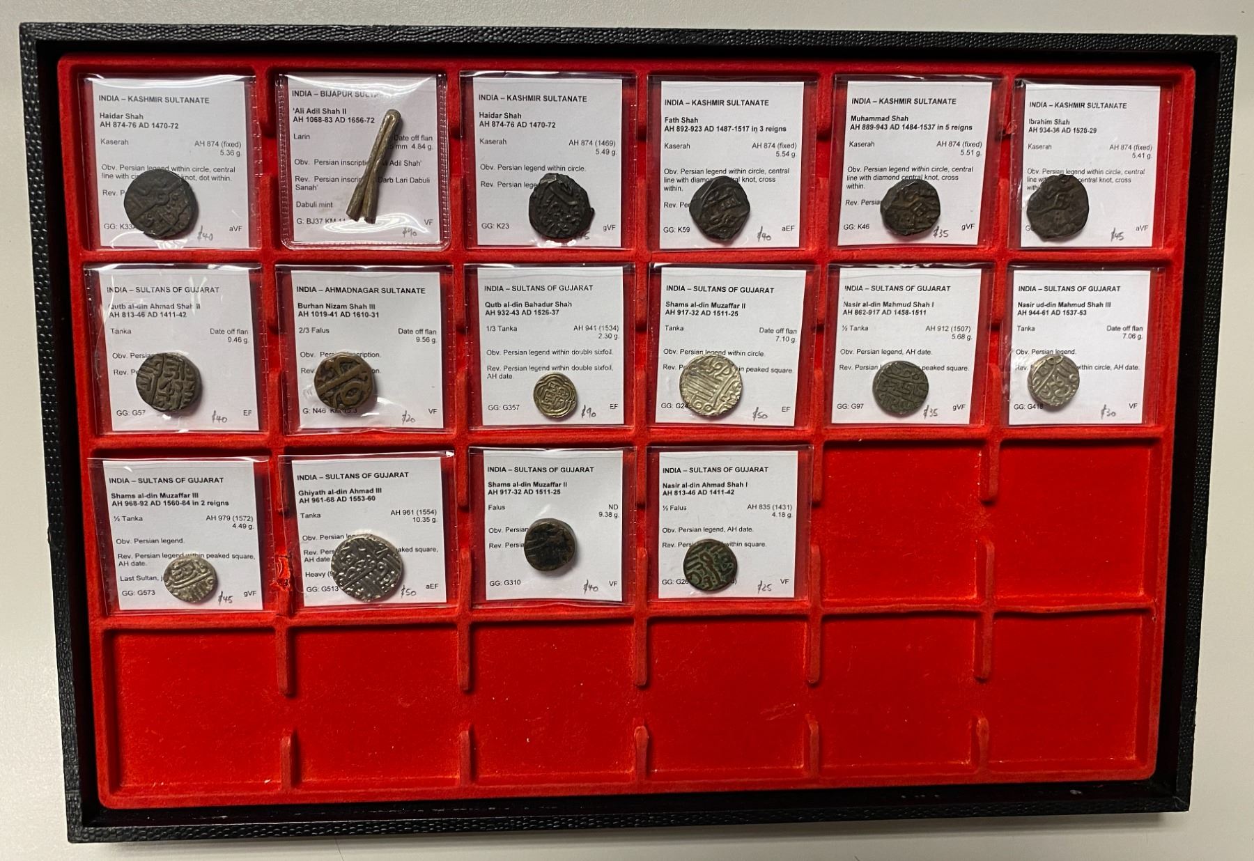 INDIAN SULTANATES: LOT of 7 silver & 9 copper coins, Bijapur (1 silver larin, weak strike); Ahmadnagar (1 copper); Gujarat (6 silver & 3 copper); and Kashmir (5 copper); common types, mostly above average grades; all with Todd's description; retail value $340, lot of 16 pieces, ex Ian Todd Collection.