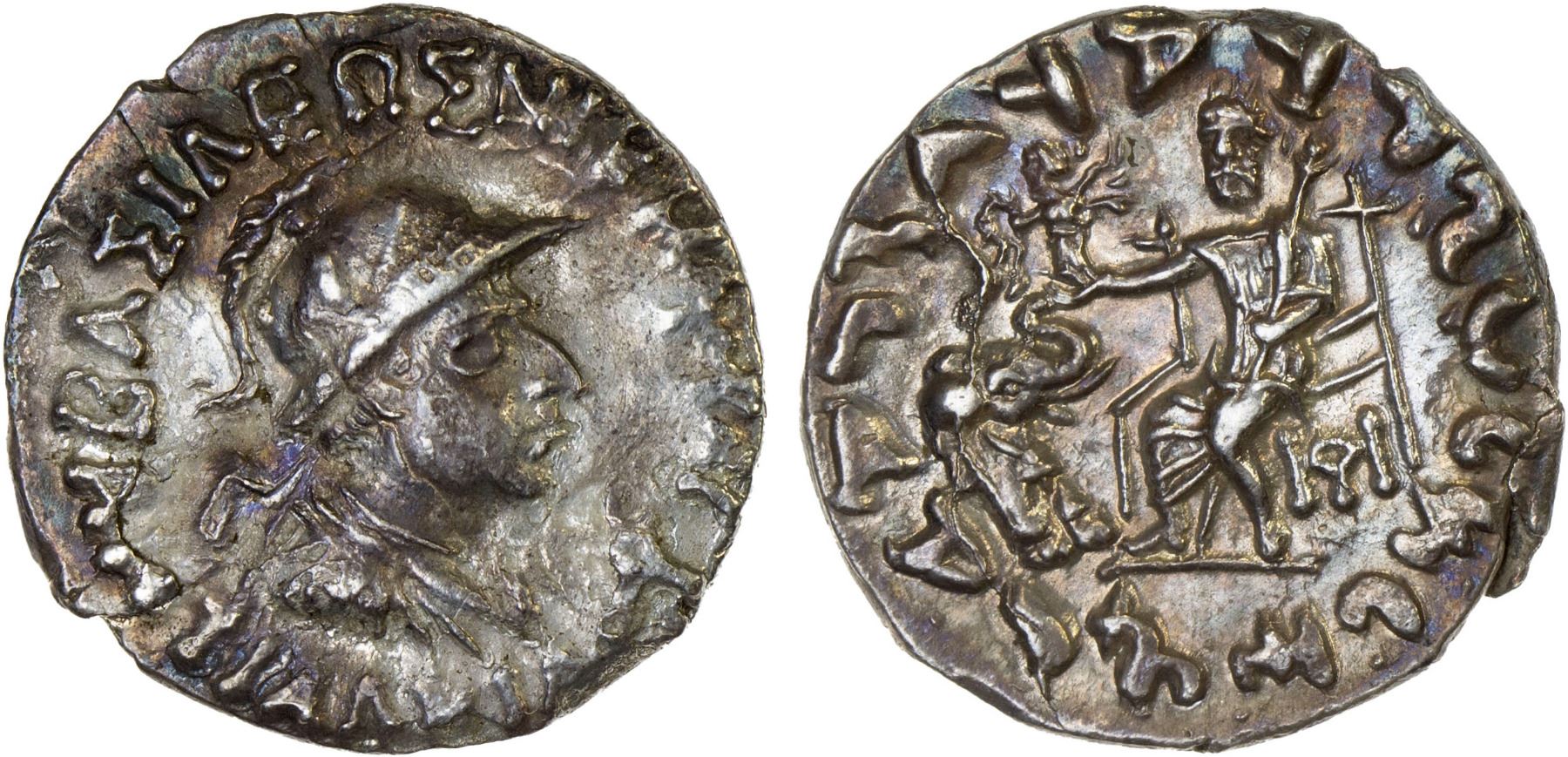 INDO-GREEK: Antialkidas, ca. 115-95 BC, AR drachm (2.27g), Pushkalavati mint? Bop-22, helmeted bust right / Zeus enthroned left, elephant before; Indic legends, XF.
