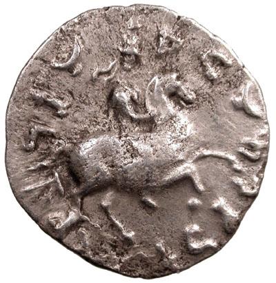 INDO-GREEK: Antimachos II, ca. 160-155 BC, AR drachm (2.27g), Pushkalavati, Mitch-1673, winged Nike standing left, holding wreath and palm, monogram left, Greek legend around / diademed king on horseback galloping right, Kharosthi legend, Extremely Fine.