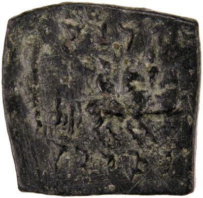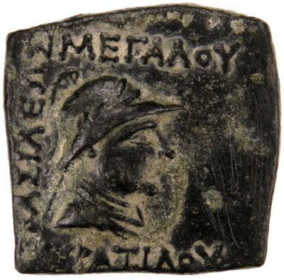 INDO-GREEK: Eukratides I, ca. 200-190 BC, AE square ¼ obol (9.51g), Bop-19G, helemeted bust right / Dioscuri mounted, scratches on reverse, few scratches on obverse, bold obverse bust, Very Fine.