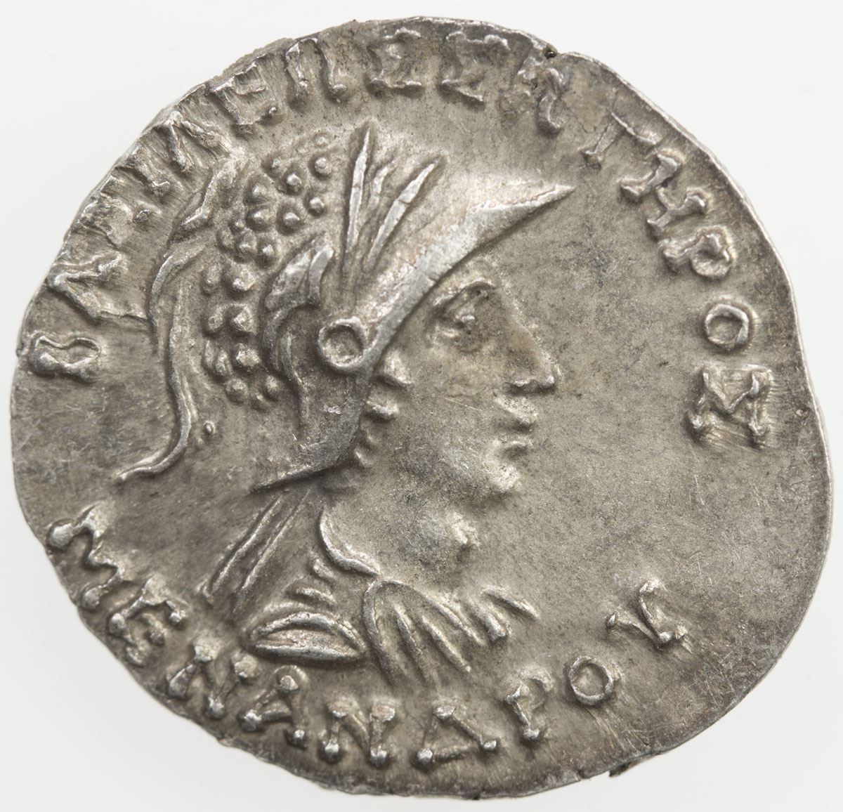 INDO-GREEK: Menander I Soter, ca. 155-130 BC, AR drachm (2.46g), Bop-16E, monogram right, bold strike, attractive toning, AU.