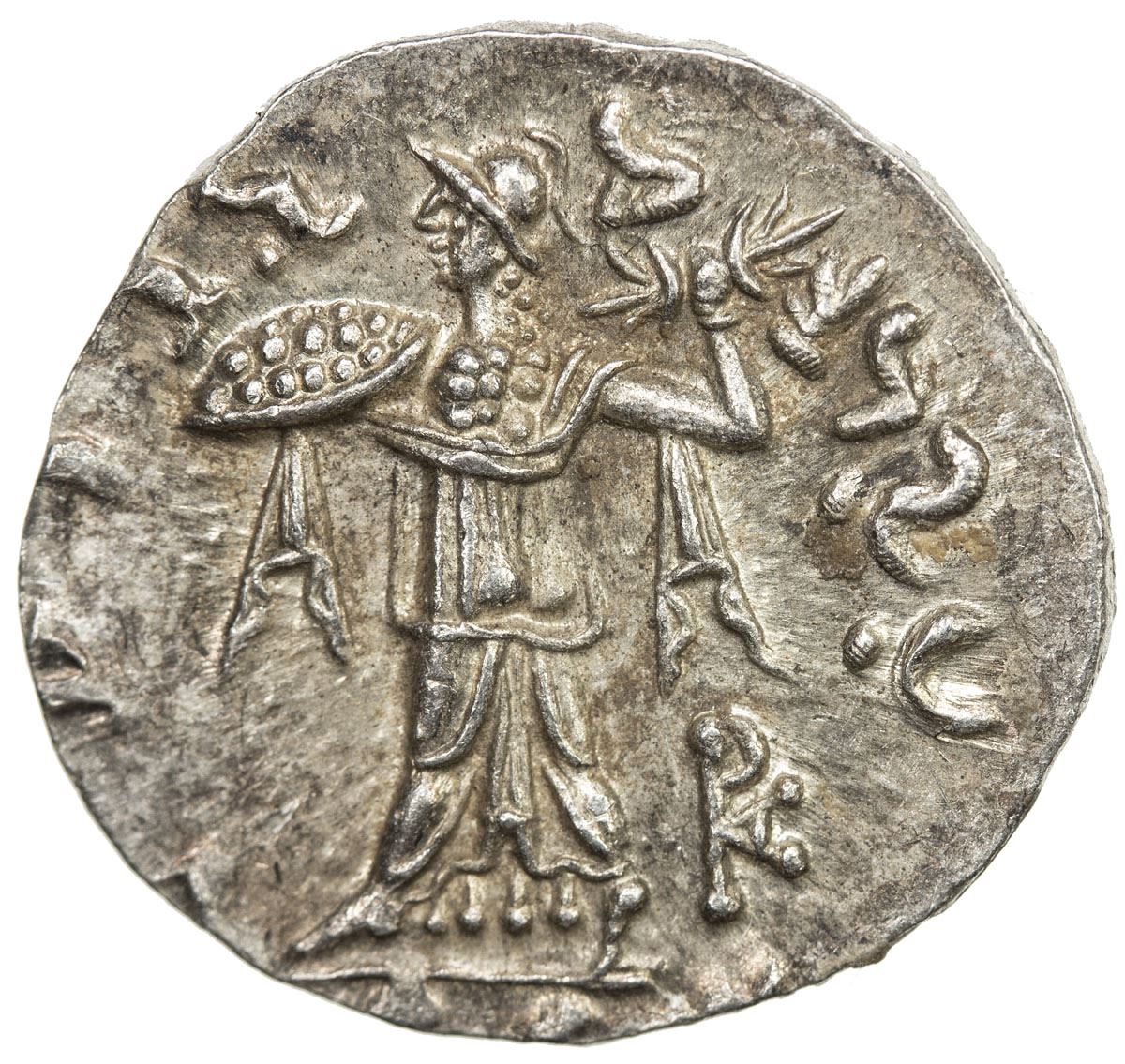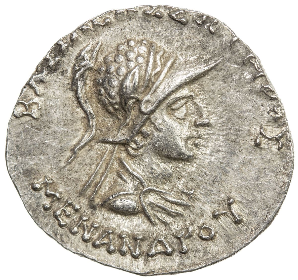 INDO-GREEK: Menander I Soter, ca. 155-130 BC, AR drachm (2.47g), Bop-16E, monogram right, fabulous strike, iridescent toning, bold AU.