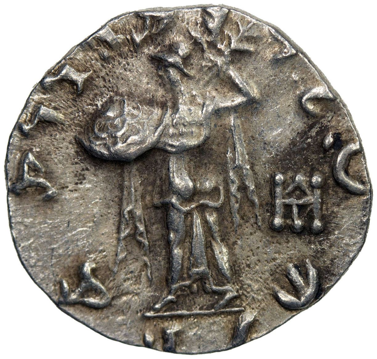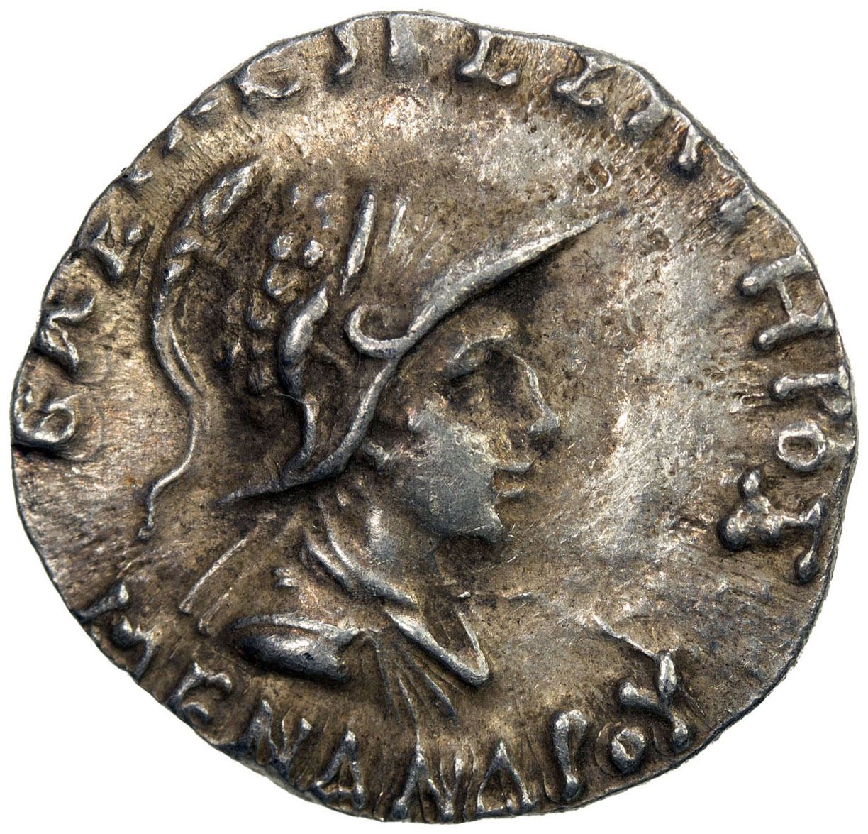 INDO-GREEK: Menander I, ca. 155-130 BC, AR drachm (2.46g), Bop-16—, helmeted bust right // Pallas standing, holding thunderbolt & shield, monogram right, bold strike, monogram unlisted by Bopearachchi for this type (monogram G for type Bop-13), AU.