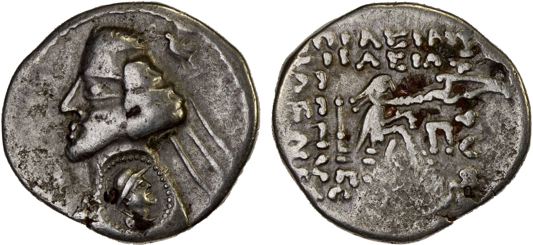 INDO-PARTHIAN: Anonymous, late 1st c. BC to early 1st c. AD, AR drachm (3.14g), Senior-199.1D, countermark of helmeted bust right within dotted border, applied on the obverse of Phraates IV of Margiane (Sellwood-52.19), diademed bust left, eagle holding wreath behind // archer seated right, P (mintmark) to right, lovely bold countermark, VF-XF on near VF host.