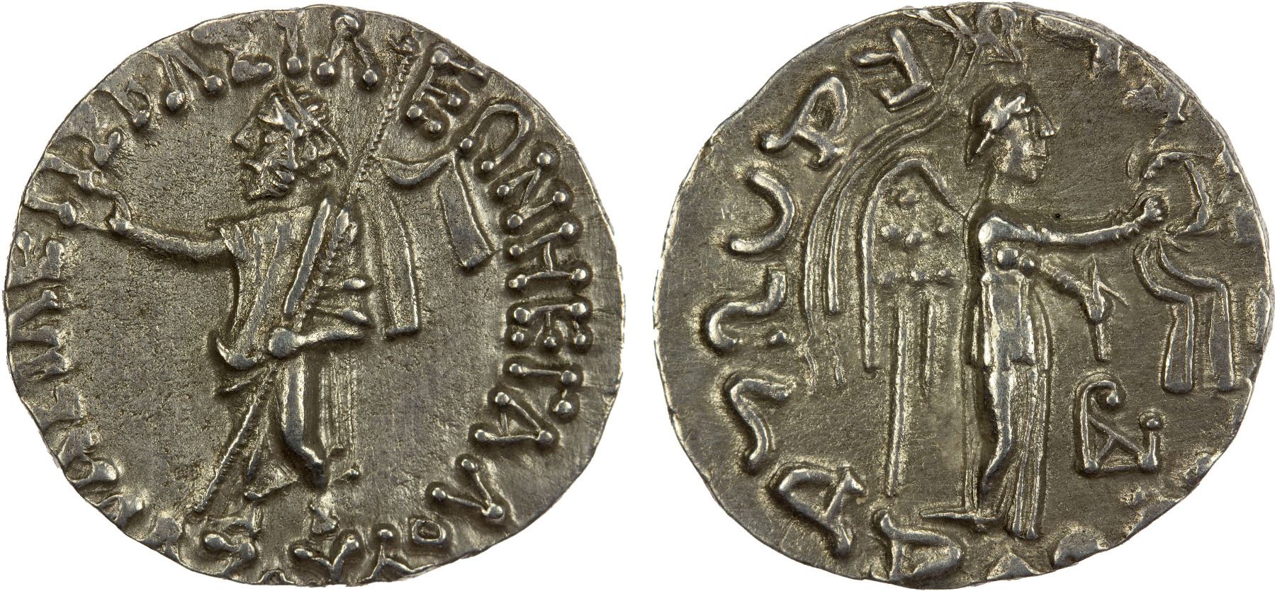 INDO-SCYTHIAN: Azes I, ca. 58-12 BC, AR drachm (2.31g), Mitch-2206-9, Zeus standing left, holding out torque in right hand and scepter in left // Nike standing right, holding filleted wreath and palm frond, bold strike, EF.