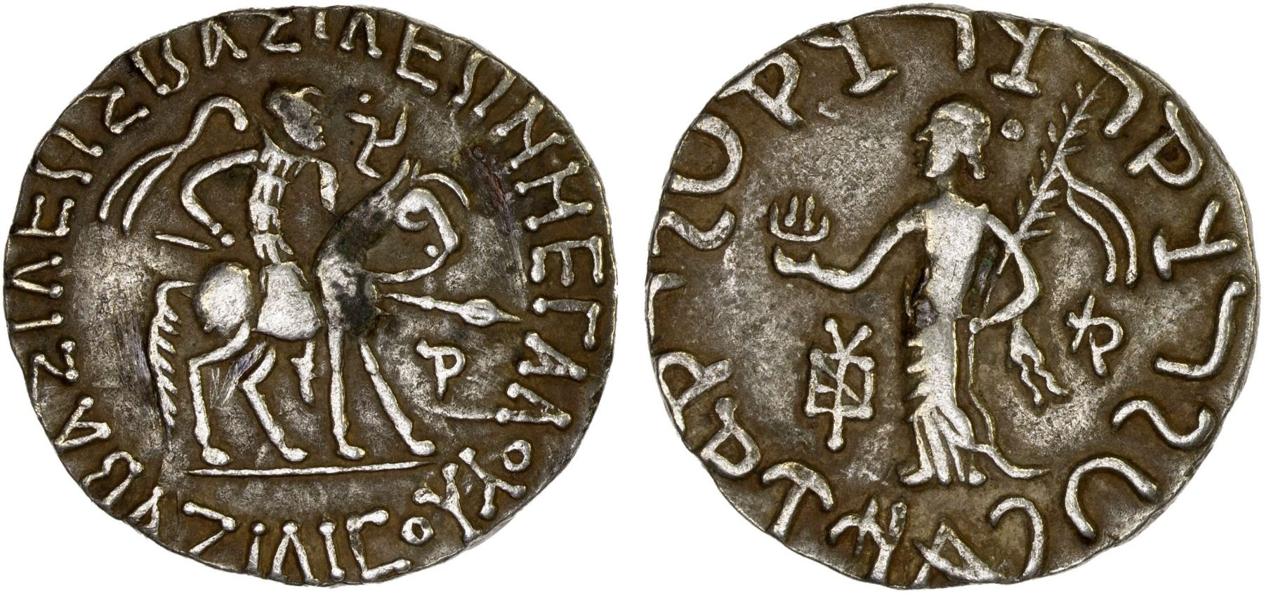INDO-SCYTHIAN: Azilises, ca. 57-35 BC, AR tetradrachm (9.36g), Mitch-2370/77, king on horseback, holding whip // city goddess standing, holding lamp & palm branch; wonderful strike on broad planchet, with full legends on both sides, VF-XF, ex Ian Todd Collection.