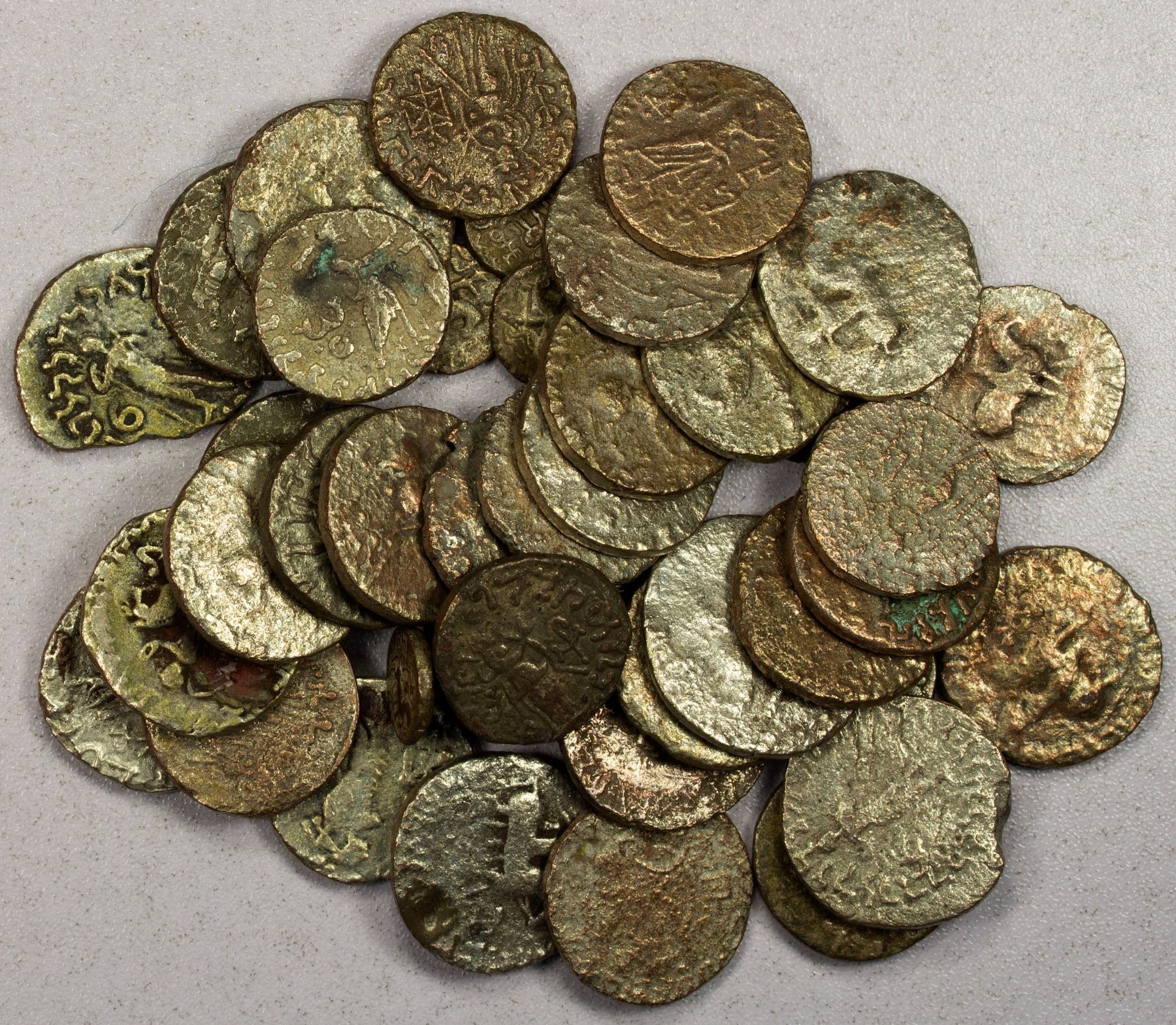 INDO-SCYTHIAN: LOT of 41 silver coins, all tetradrachms except 6 drachms, including a variety of Indo-Scythian, Indo-Parthian, Apracharaja, Kushan types, most somewhat debased (one fourrée); most VG to Fine with moderate porosity, some chipped; retail value $600, lot of 41 pieces.