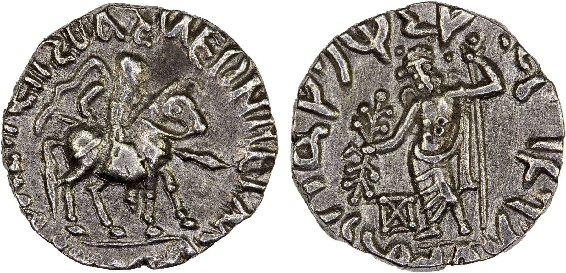 INDO-SCYTHIAN: Vonones, ca. 90-65 BC, AR drachm (2.44g), Senior-70.1, king on horseback right, holding spear // Zeus standing facing, holding scepter and thunderbolt, monogram to inner left, light scratches, XF.