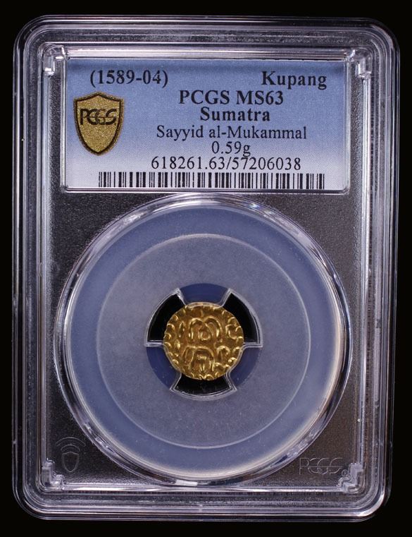 ACEH: Alauddin Ri'ayat Syah Sayyid al-Mukammal, 1589-1604, AV kupang (0.59g), Leyten-A13c, a lovely mint state example! PCGS graded MS63, ex Jürgen M. Wilmes Collection.