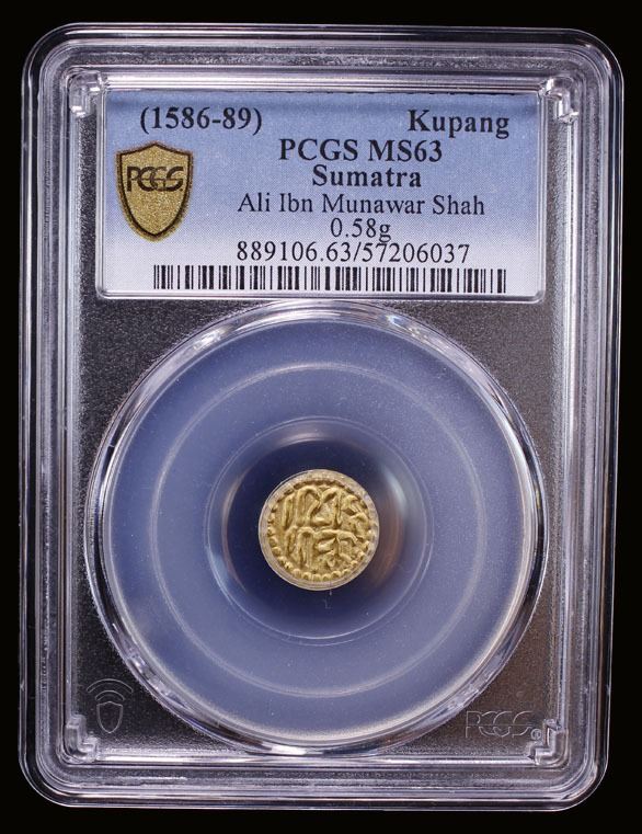 ACEH: 'Ali bin Munawar Shah, 1586-1589, AV kupang (0.58g), Leyten-A12B, a lovely mint state example! PCGS graded MS63, ex Jürgen M. Wilmes Collection.