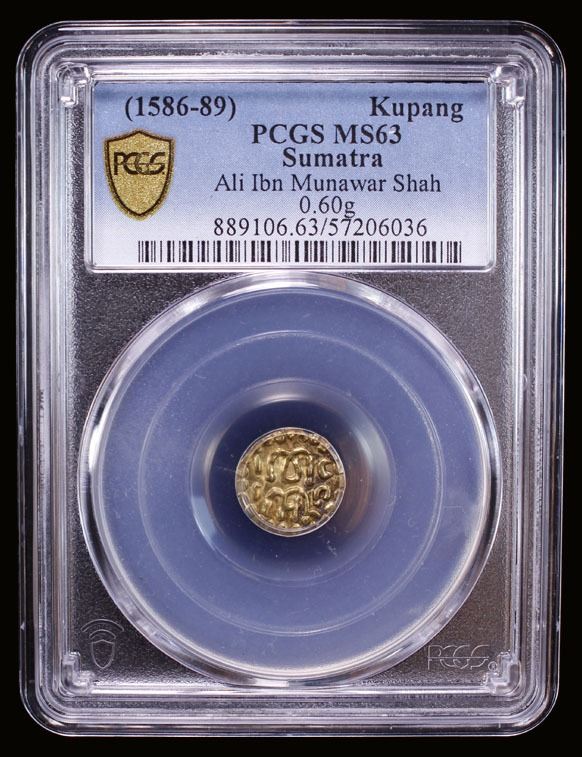 ACEH: 'Ali bin Munawar Shah, 1586-1589, AV kupang (0.60g), Leyten-A12, a lovely mint state example! PCGS graded MS63, ex Jürgen M. Wilmes Collection.