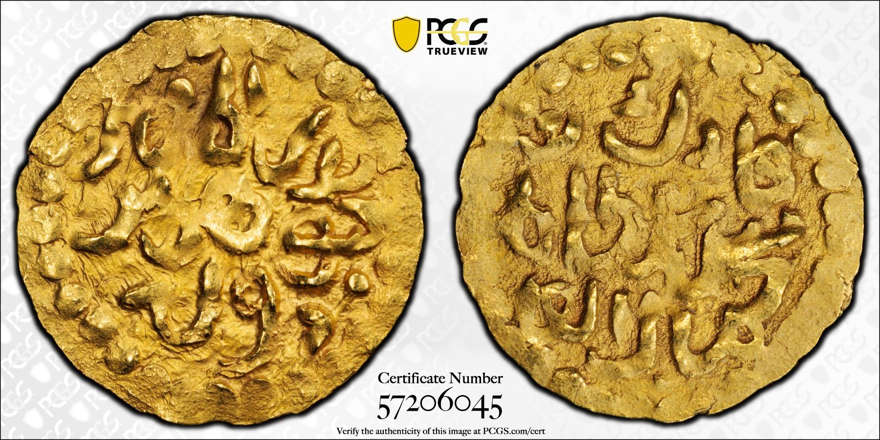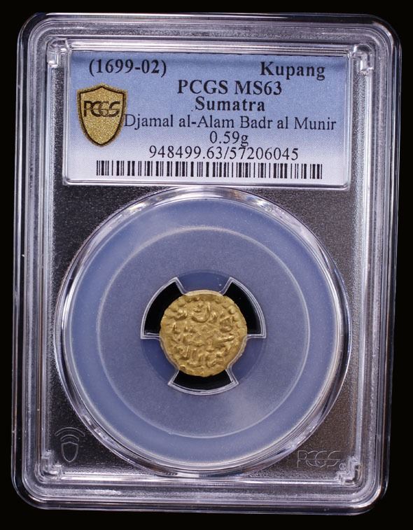 ACEH: Djamal al-Alam Badr al-Munir, 1699-1702, AV kupang (0.59g), Leyten-A23, a lovely mint state example! PCGS graded MS63, ex Jürgen M. Wilmes Collection.
