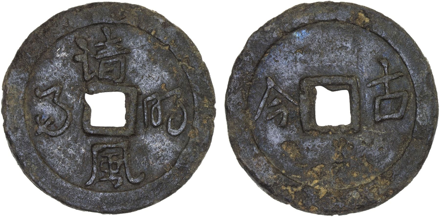 BANGKA ISLAND: tin cash (6.27g), ca. 1775-1812, Millies-222, Harsono-2, qing feng ming yue (cin fung min nglat in Hakka, "clear breeze, bright moon") // gu jin (ku kim, "from the ancient times to today"), very rare, light pitting, VF.