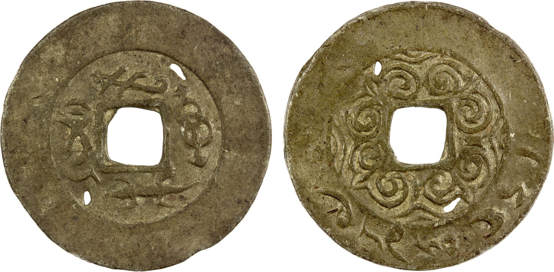 INDONESIA: BANGKA ISLAND: tin jokoh (3.29g), ca. 1775-1812, Harsono-379, M&Y-8, reptile (crocodile?) with stylized inscriptions // geometric patterns, symbols on margin above, two natural casting holes, VF-EF, RR.