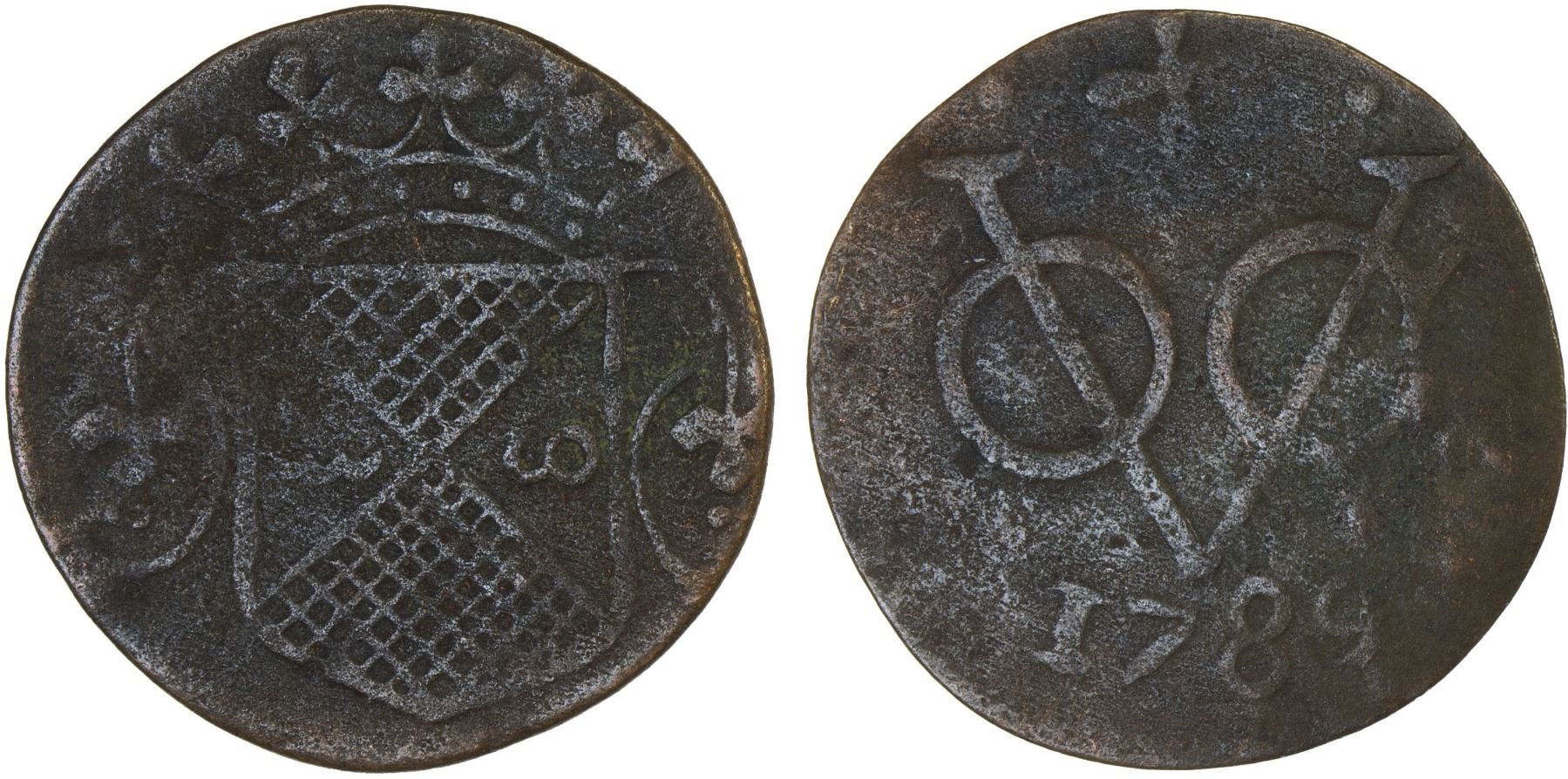 INDONESIA: BANJARMASIN: AE duit (1.18g), Moquette-47, imitating uncertain VOC issue dated 1789, with Jawi inscription (tentatively read as mâ-sâ) on shield, light porosity, VF, ex Jürgen M. Wilmes Collection.