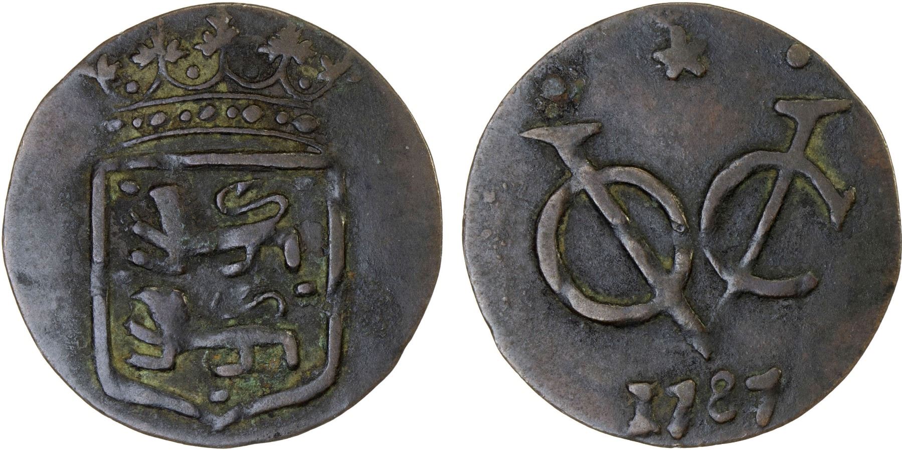 INDONESIA: BANJARMASIN: AE duit (1.40g), cf. Moquette-29, imitating VOC issue of West Friesland dated 1787 (KM-131), attractive patina, Choice VF, ex Jürgen M. Wilmes Collection.