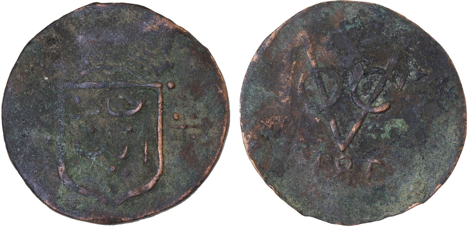 INDONESIA: BANJARMASIN: AE duit (1.53g), cf. Moquette-84A, imitating uncertain VOC issue, with stylized Jawi inscription (likely for Banjarmasin) on shield and date written as I8I, VF, ex Jürgen M. Wilmes Collection.