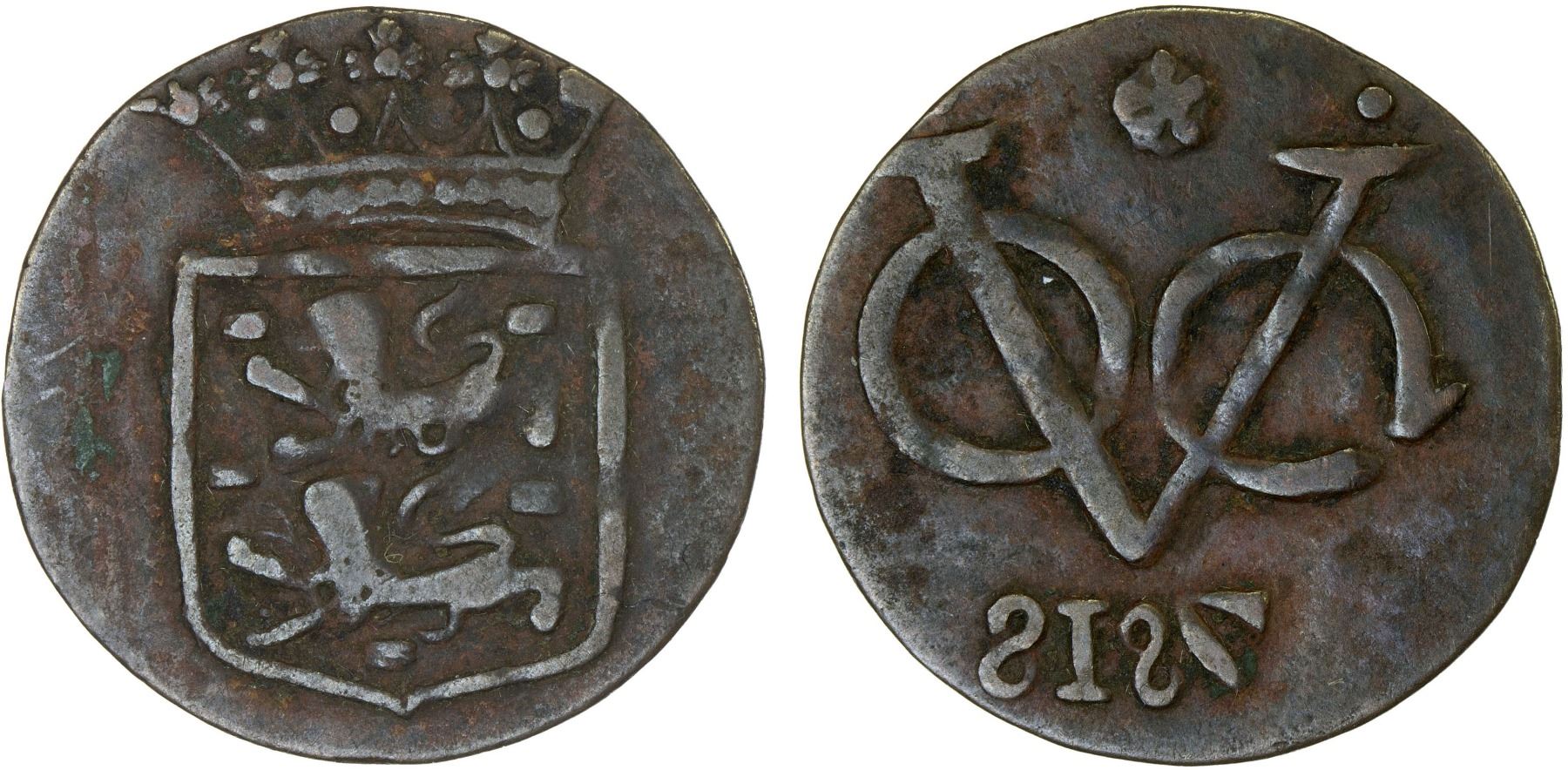 INDONESIA: BANJARMASIN: AE duit (1.55g), cf. Moquette-29, imitating VOC issue of West Friesland (KM-131) but with the date as "818[inverted 7]", VF, ex Jürgen M. Wilmes Collection.