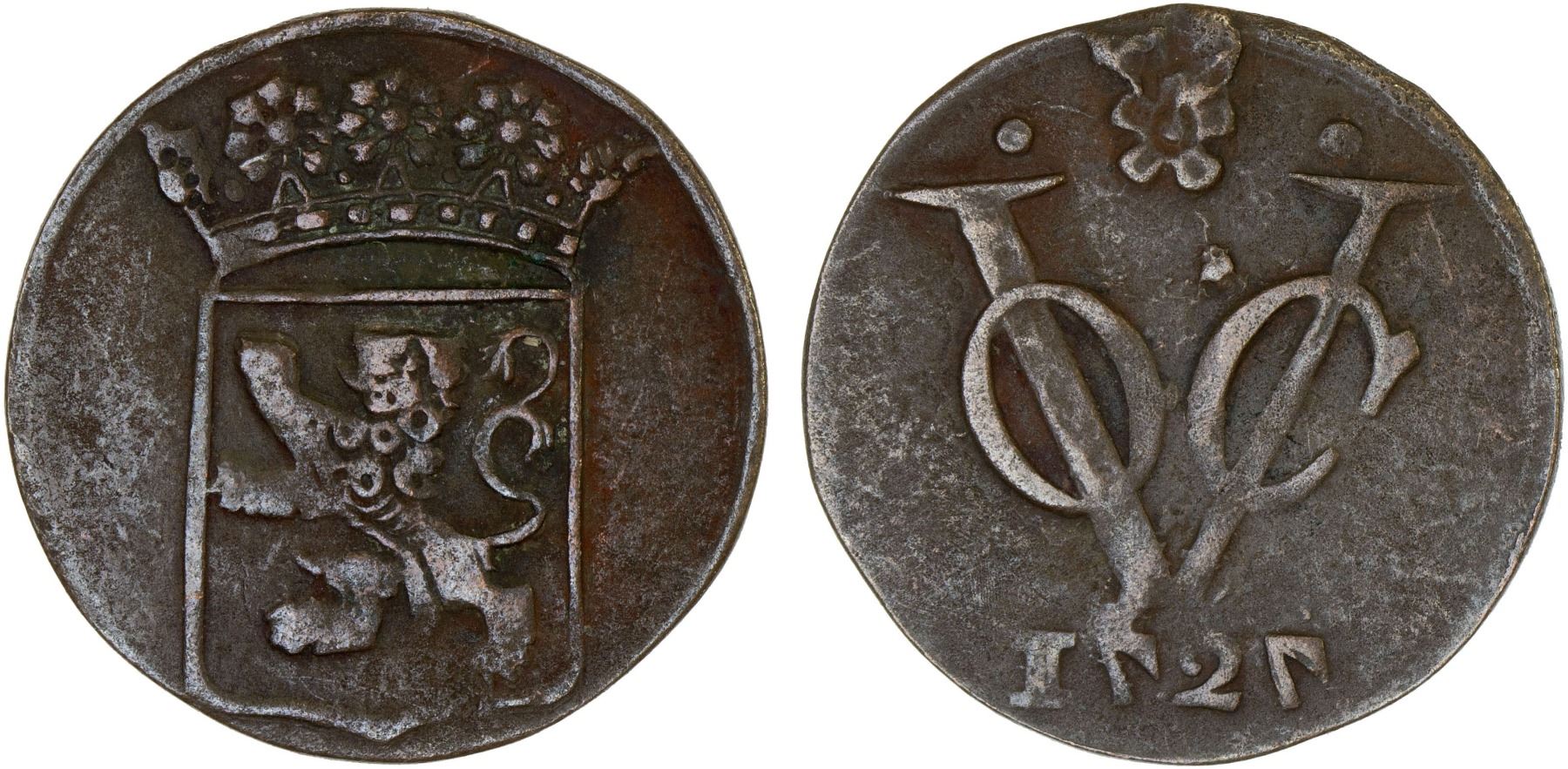 INDONESIA: BANJARMASIN: AE duit (2.55g), cf. Moquette-71, imitating VOC issue of Holland dated 1727 (KM-70) but with inverted 7's in date, attractive patina, Choice VF, ex Jürgen M. Wilmes Collection.