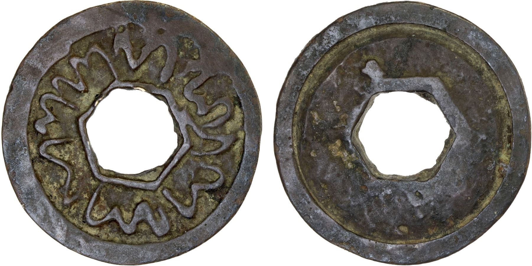 INDONESIA: BANTAM: AE cash (10.85g), cf. Millies-112, 27mm, pangeran ratou in somewhat stylized Javanese script, uniface, smaller but thicker and heavier than usual, possibly made as an amulet, VF-XF, ex Jürgen M. Wilmes Collection.