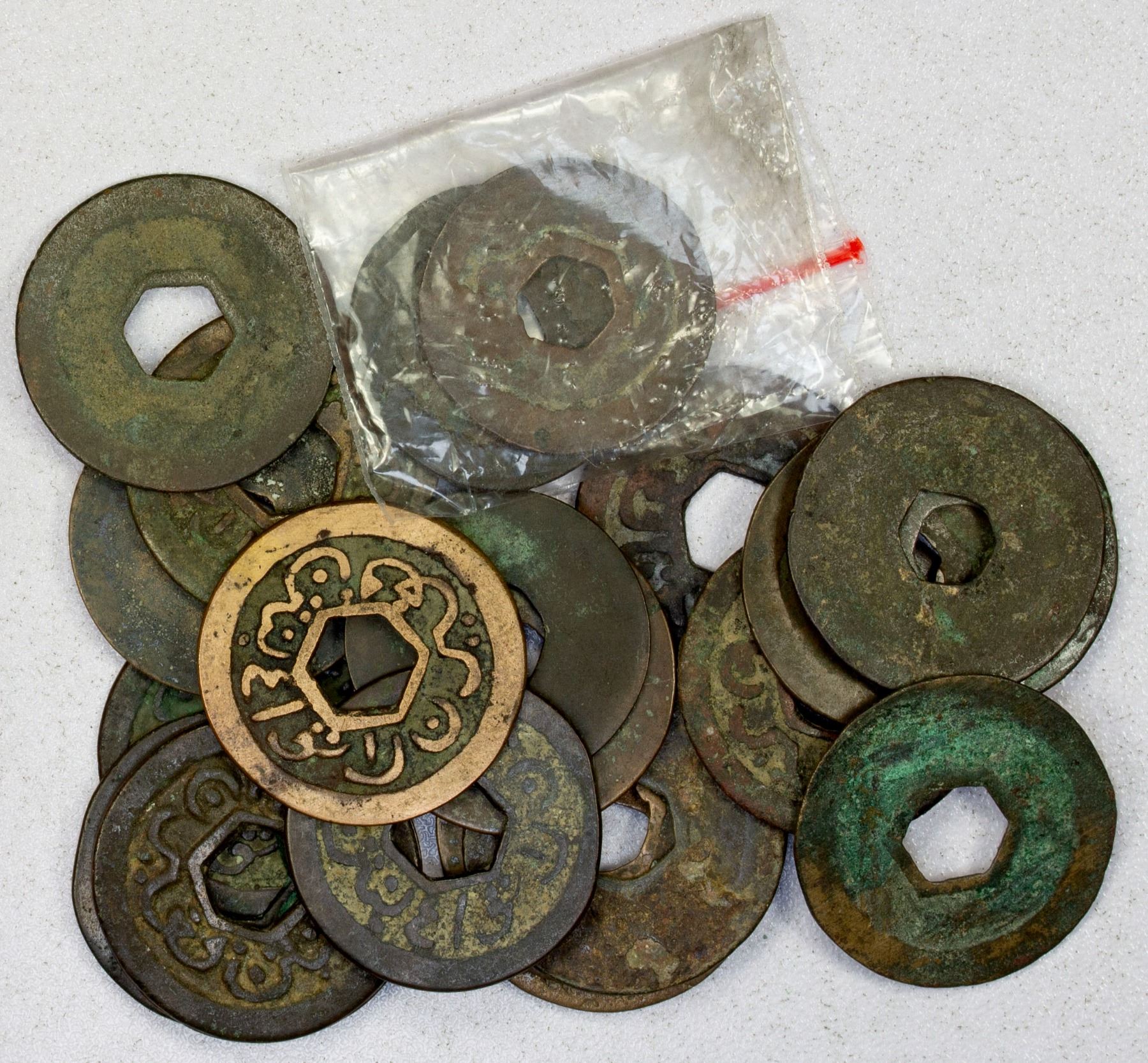 BANTAM: LOT of 22 AE cash coins, all Millies-113 except two, with Jawi inscription panggeran ratu ing banten (Panggeran, Lord of Bantam) around central hexagonal hole; two coins with same title in Javanese and the syllable Ja on reverse (cf. Zeno-172945); most Fine to VF, the majority with light discoloration or porosity, many with bold lettering; retail value $500, lot of 22 pieces, ex Jürgen M. Wilmes Collection.