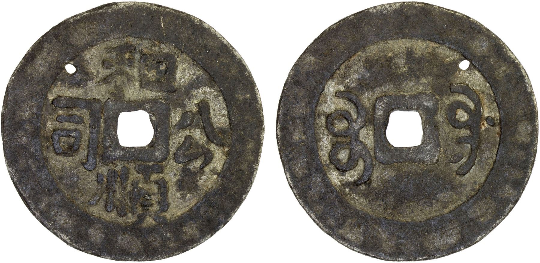 BORNEO: He Shun Gongsi, tin cash (4.87g), ca. 1780-1808, cf. Zeno-247341, Yih & de Kreek-20 (NC 1993), Chinese legend he shun gong si // imitative Manchu inscriptions, small casting hole, VF. He Shun Gongsi was established in 1776 when 14 smaller mining societies (gongsi) united into one federation. It became one of the largest gongsi republics and dominated gold mining in the Montrado region. Its success brought it into conflict with the Dutch, who waged two wars against it in 1822-24 and 1850-54, culminating in its surrender and dissolution in July 1854. Subsequently, most coins issued by the gongsi were melted down.
