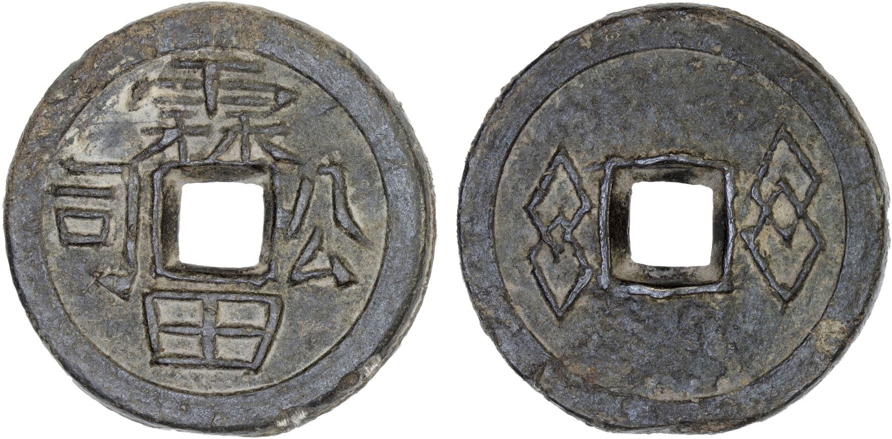 BORNEO: Lin Tian Gongsi, tin cash (8.81g), ca. 1780-1825, Millies--, Yih & de Kreek--, Zeno--, Chinese legends lin tian gong si (lim tian kong si in Hakka) // two interlocking diamonds to left and right, Choice VF, unpublished type, XF, RRR. Lin Tian Kongsi was established ca. 1780 by Chinese miners from Montrado in western Borneo. In 1825 it was forced to join the He Shun federation and abandon its name. While coins bearing the name of this gongsi are well-known, none are known with the diamond design on the present example. The same pattern also appears on the reverse of membership tokens of the Golden Coin Society, a later Chinese secret society active in Zhejiang and Fujian active 1858-62 (see our Auction 51, Lot 1531). It is unclear whether there is a connection between these two types or that the similarity is purely coincidental.